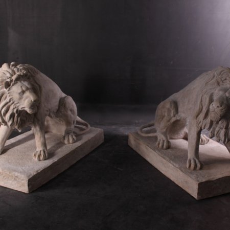 Symmetrical Pair of 39 Inch Entry Lions in Rough Stone
