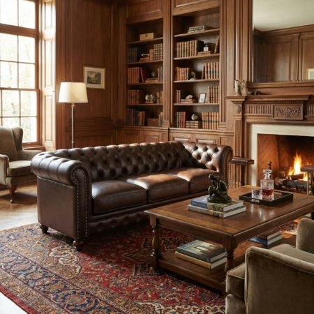 Classic Chesterfield Brown Sectional with Ottoman (KIT)
