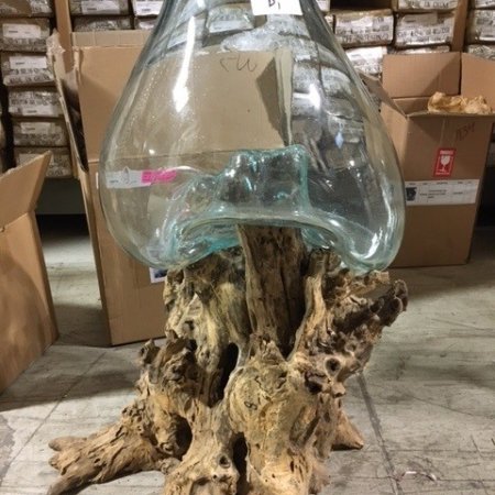 Mountain Studios Large Artistic Blown Glass and Natural Teak, Fish Bowl