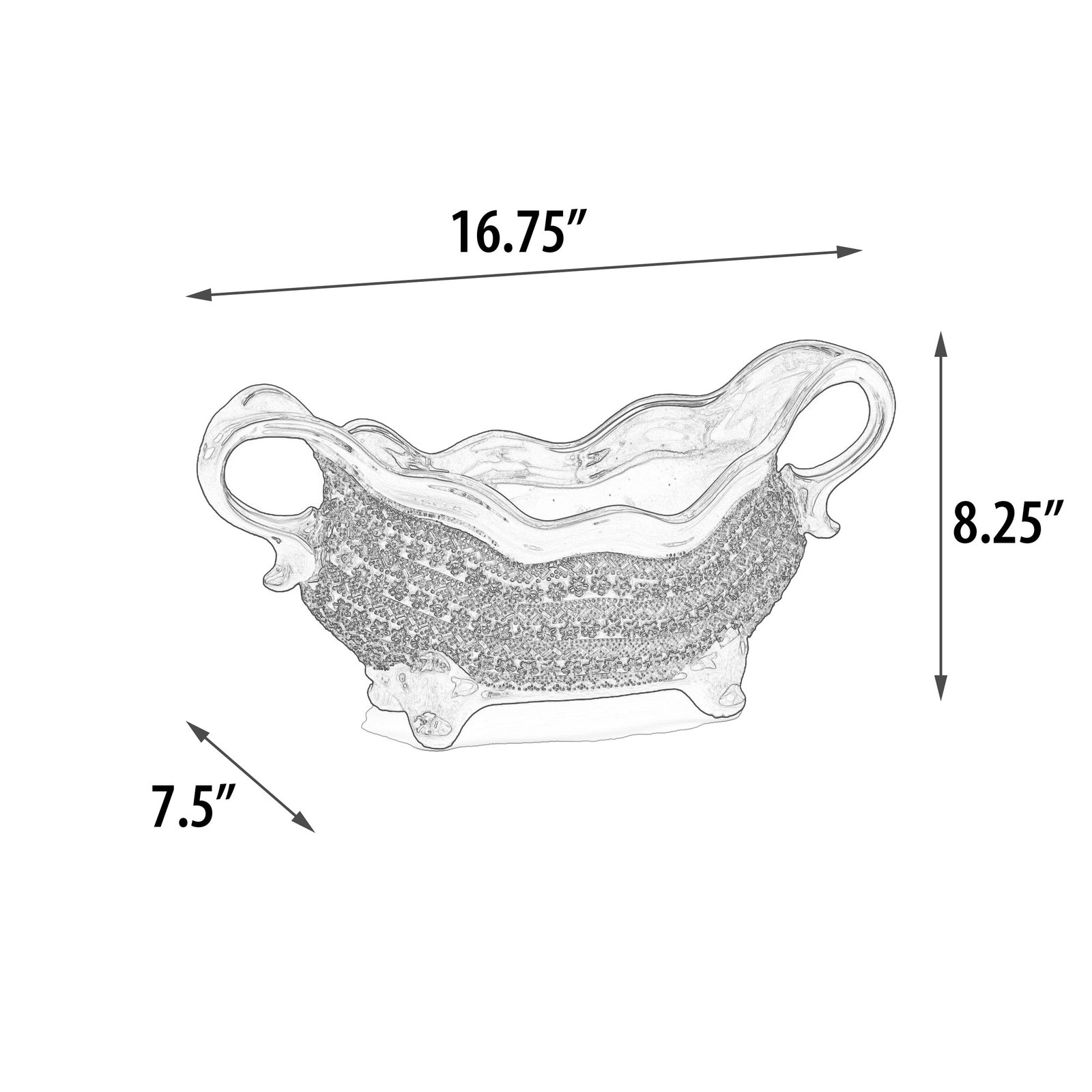 The 16.7 inch wide Amber Floral Tureen is a beautiful and deeper shaped oblong center bowl. It is hand cast in porcelain with a striking gold plated body and accents. Features hundreds of individually hand applied Amber and Clear rhinestones. The gold, amber and white colors create a soft contrast effect on this handcrafted functional decor item. Sold separately but often ordered in pairs for balance or symmetry. Also consider adding to other items from the Amber Floral series for a larger display affect. No Assembly required.