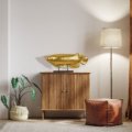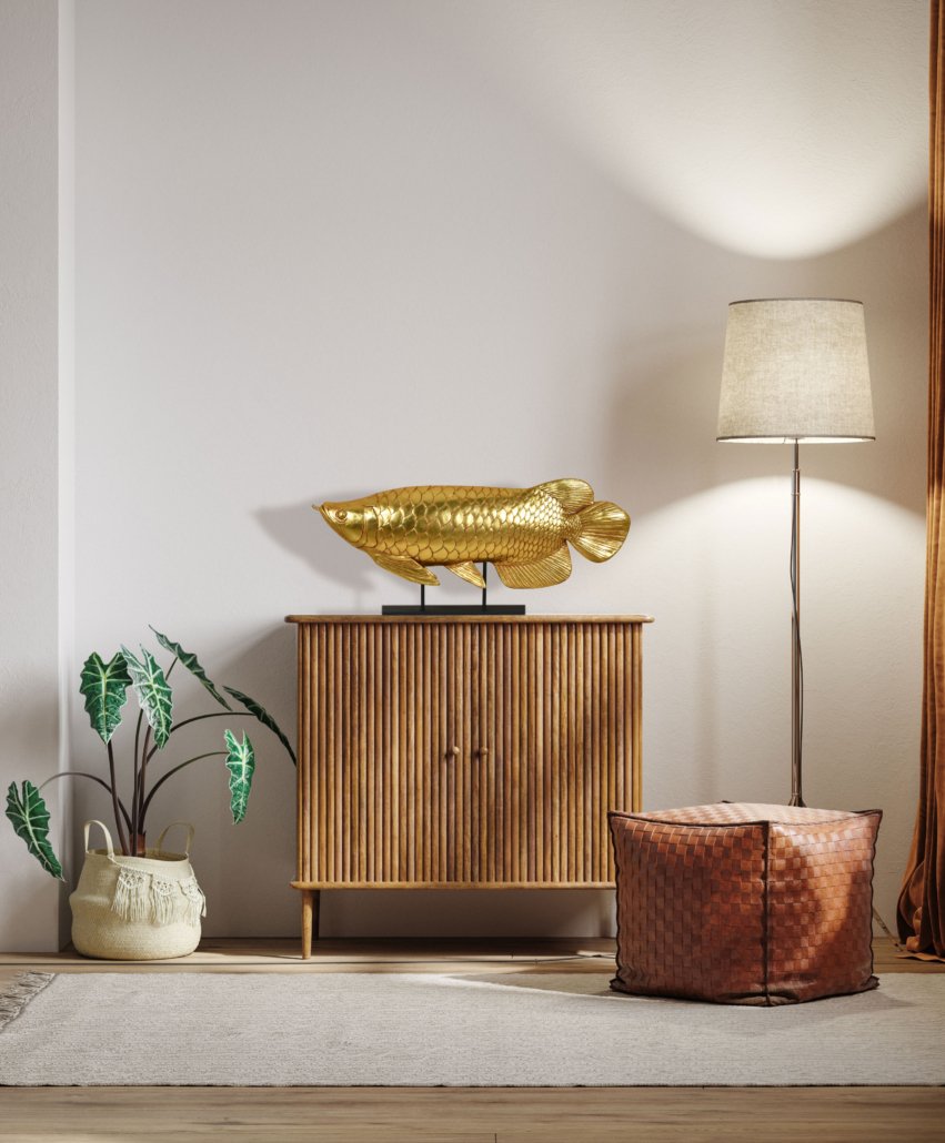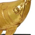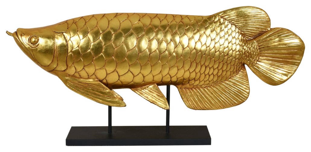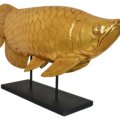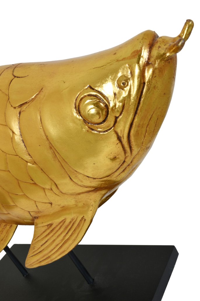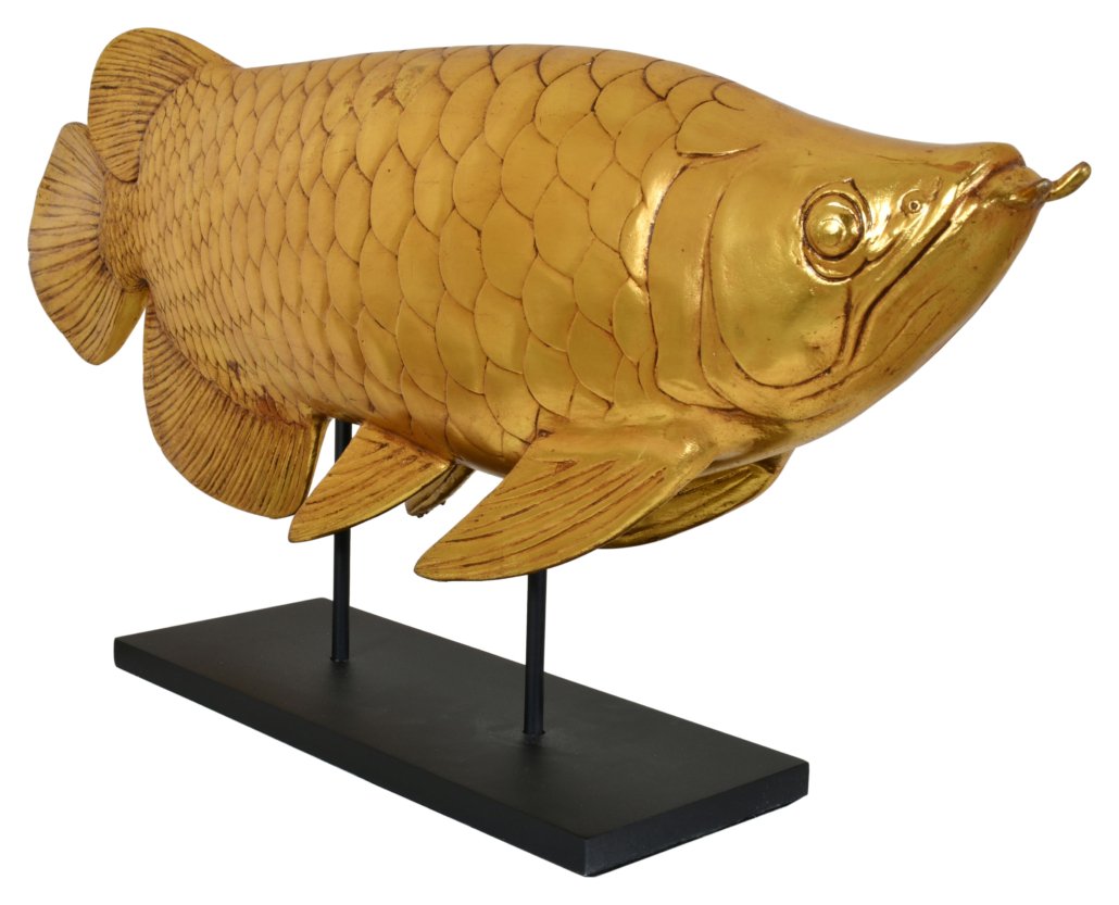 At 33 inches wide the Aronwana Fish on Stand has a commanding presence. Cast in fiberglass and finished with gold leaf the sculpture quickly becomes a feature in a room. Light assembly is required.