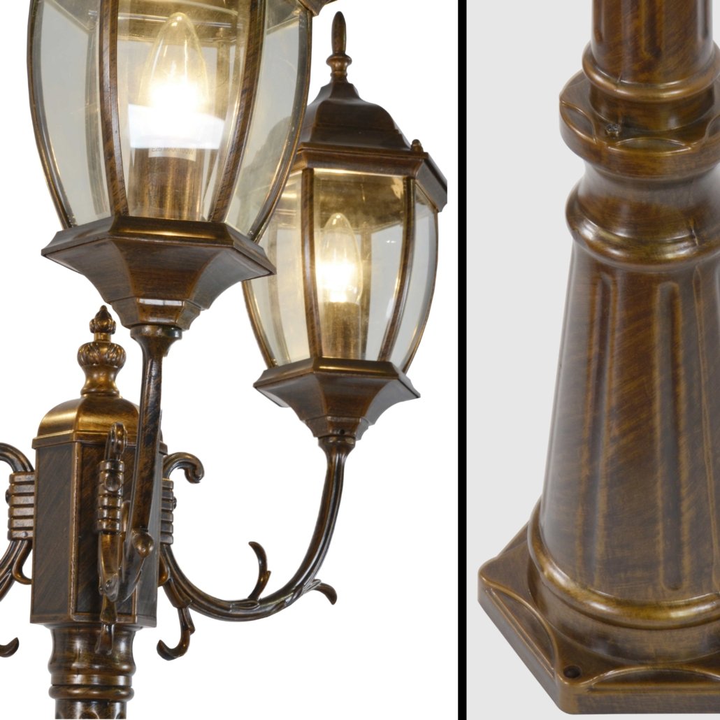 The Elegant Aston 3 Light Street Lamp is over 7ft in height and is constructed of cast aluminum. The lamp features 3 pre-wired lanterns with sockets and a brushed antique finish with bronze and copper tones. Main electrical wiring is necessary.