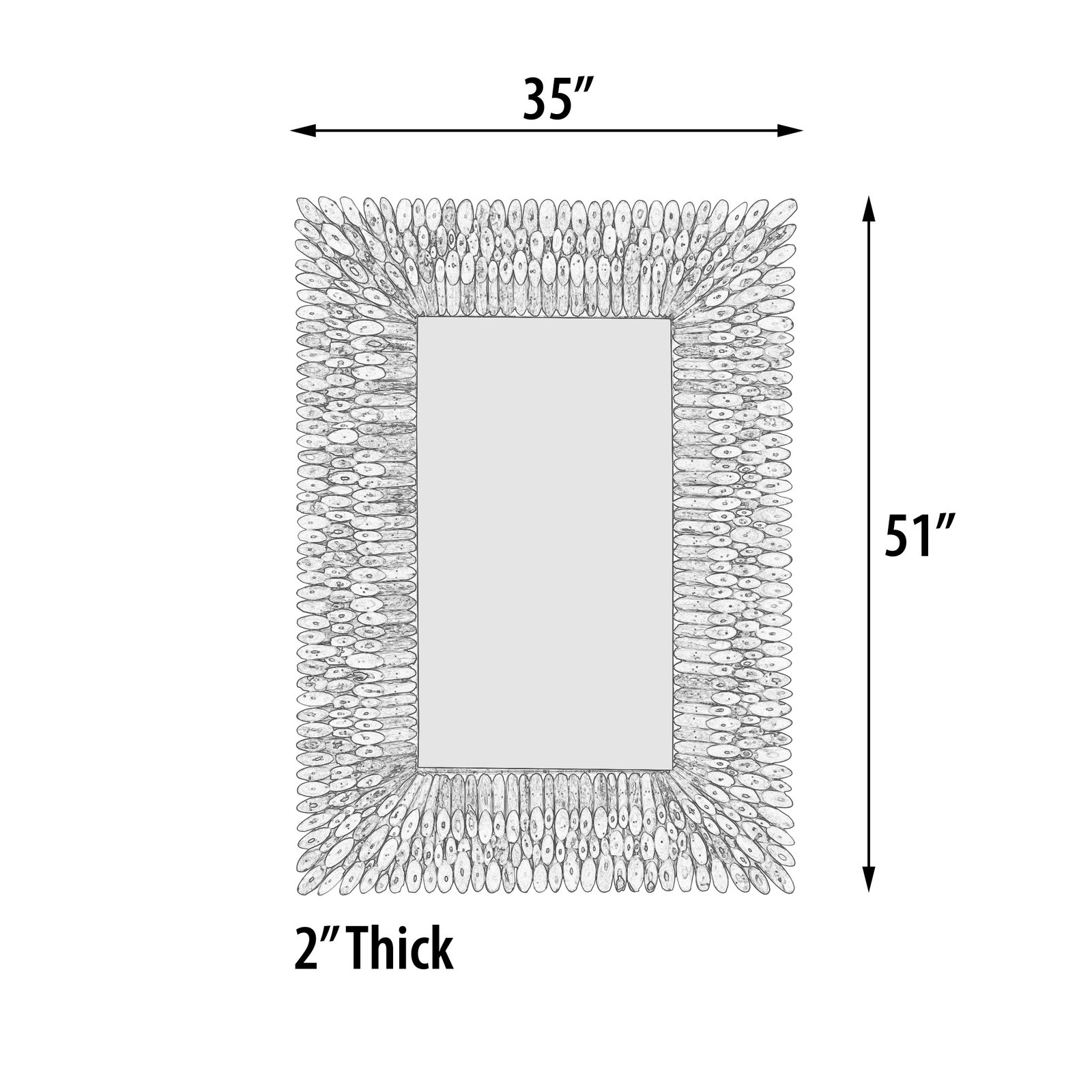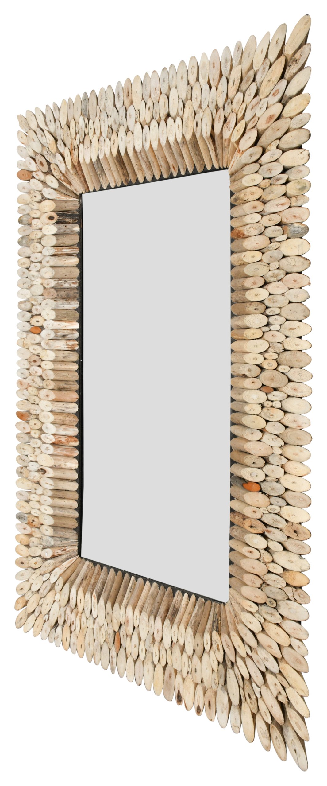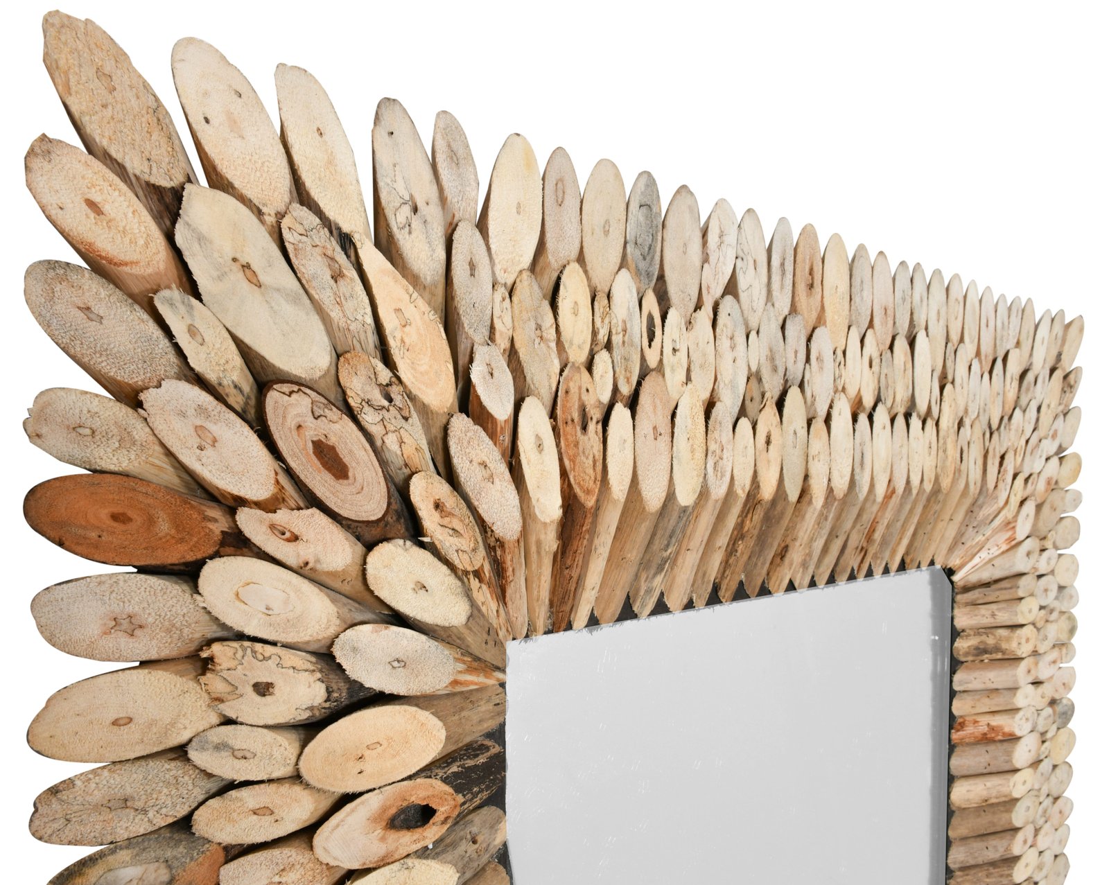 Enhance your living space with the Natural Wood Rectangular Mirror, measuring 35 inches wide by 51 inches tall, which beautifully marries rustic charm and natural elegance. Crafted with an all-natural wood frame, each piece begins as a small peg before being cross sectioned to create a flat surface with uniquely textured ends, showcasing the intrinsic beauty of the wood. This mirror’s rustic aesthetic makes it an ideal complement not only to coastal themes but also to cabin and mountain-style decors, infusing a warm, organic ambiance into any setting. Its versatile design and substantial size make it a perfect addition for brightening rooms, amplifying space, and adding a touch of nature-inspired charm to living areas, bedrooms, entryways, or dining spaces in homes, cabins, or mountain retreats. No two Natural Wood Rectangular Mirrors are exactly alike, as each celebrates the natural variations, such as grain patterns, knots, and color differences, inherent in the wood. This feature ensures that every mirror is a distinct piece, contributing to the overall character and appeal of your decor. Ideal for those who appreciate the outdoors and wish to bring a bit of nature’s serenity indoors, this mirror offers both functionality and a striking aesthetic, enhancing your environment with its natural beauty and rustic flair.