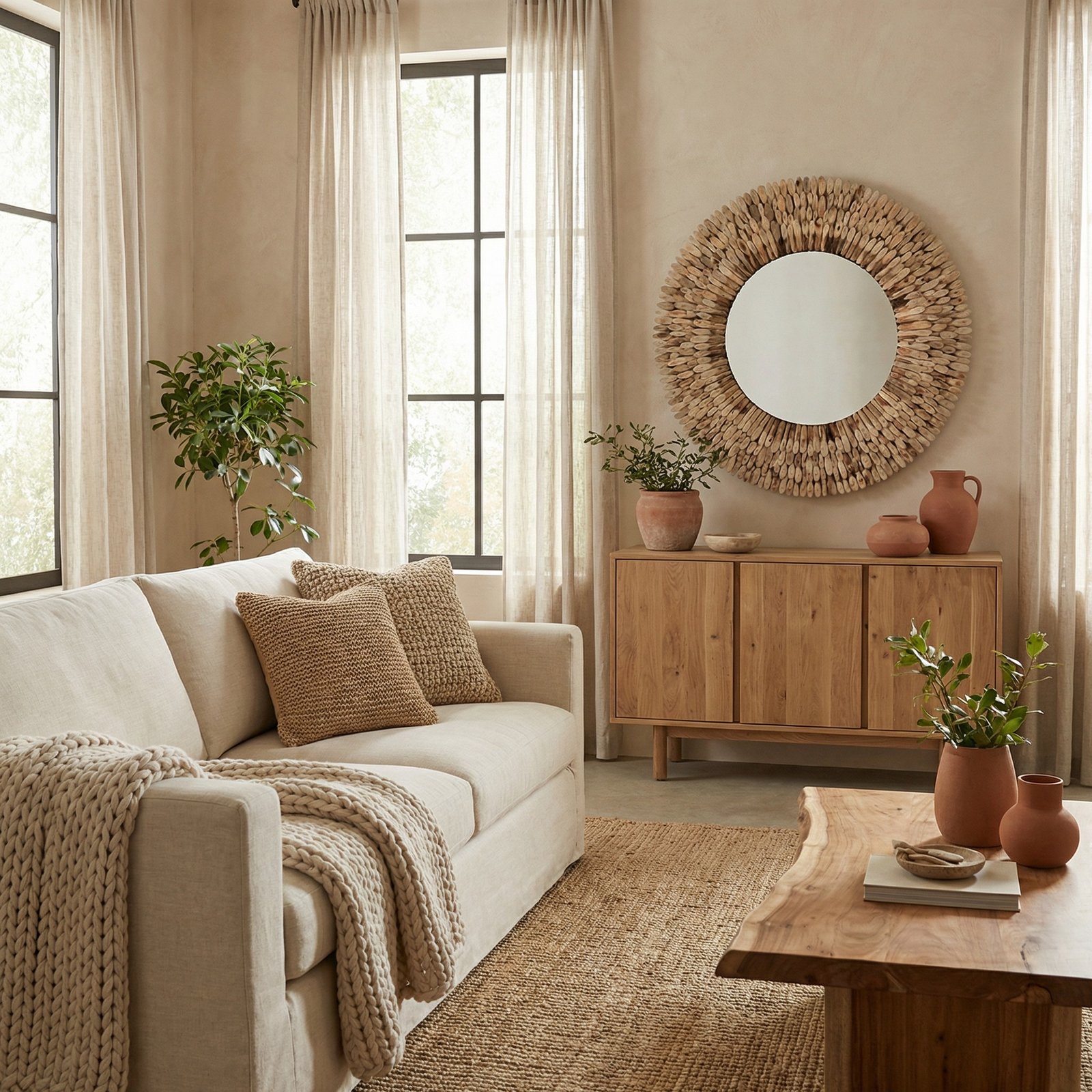 - Elevate your space with the Authentic Natural Wood Round Mirror, measuring an impressive 47 inches in diameter with a 2-inch depth. This distinctive wall-hanging mirror features a frame crafted from natural wood that has been cross sawed, providing a flat surface that retains the exquisite texture and grain patterns of the wood, adding a tactile and visual depth to the piece. The cross-sawing process enhances the frame with a unique texture, where the ends of the wood grains are exposed, creating a compelling contrast between the mirror’s smooth surface and the rusticity of the frame. This design element makes the mirror an ideal choice for various decor styles, particularly enhancing rustic, cabin, or woodland-themed settings with its natural charm. Whether placed in a living room, bedroom, or entryway, this round mirror serves as a functional piece for reflection while doubling as a striking decorative element. Its round shape offers a soft counterpoint to angular furniture, and the detailed wood frame draws the eye, making it a standout feature in any room. Celebrating the beauty of untouched wood, this mirror brings an authentic touch of the outdoors inside, perfect for those who appreciate craftsmanship and the natural allure of wood in their decor. The Authentic Natural Wood Round Mirror is not just a mirror but a piece of art that adds character and warmth to your home.