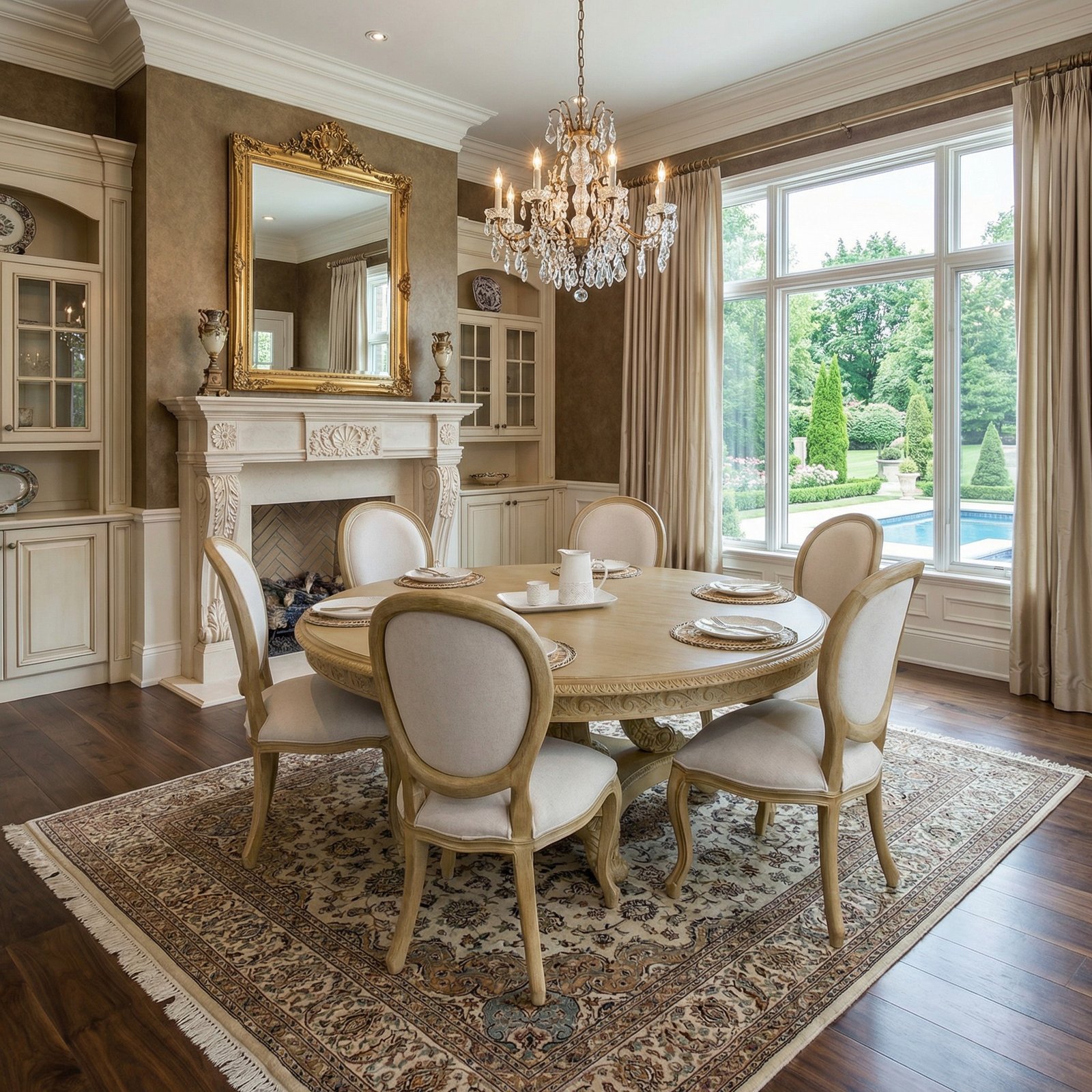 The Beachstone Mahogany Anglia Dining Table and Chair Set of 7 includes 6 Beachstone Mahogany Casual Dining Side Chairs and a spectacular Anglia 72 Round Dining Table from Heritage Furnishings a division of AFD Home. The offering includes truly one of the most intricate and beautiful hand-carved dining tables in the market, a work of carved art second to none and regardless of price. The chairs are a luxurious scale and sit perfectly.