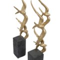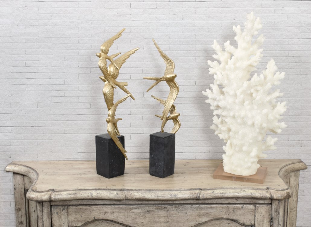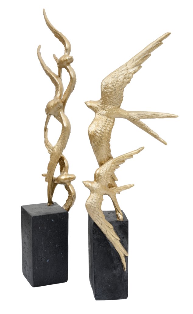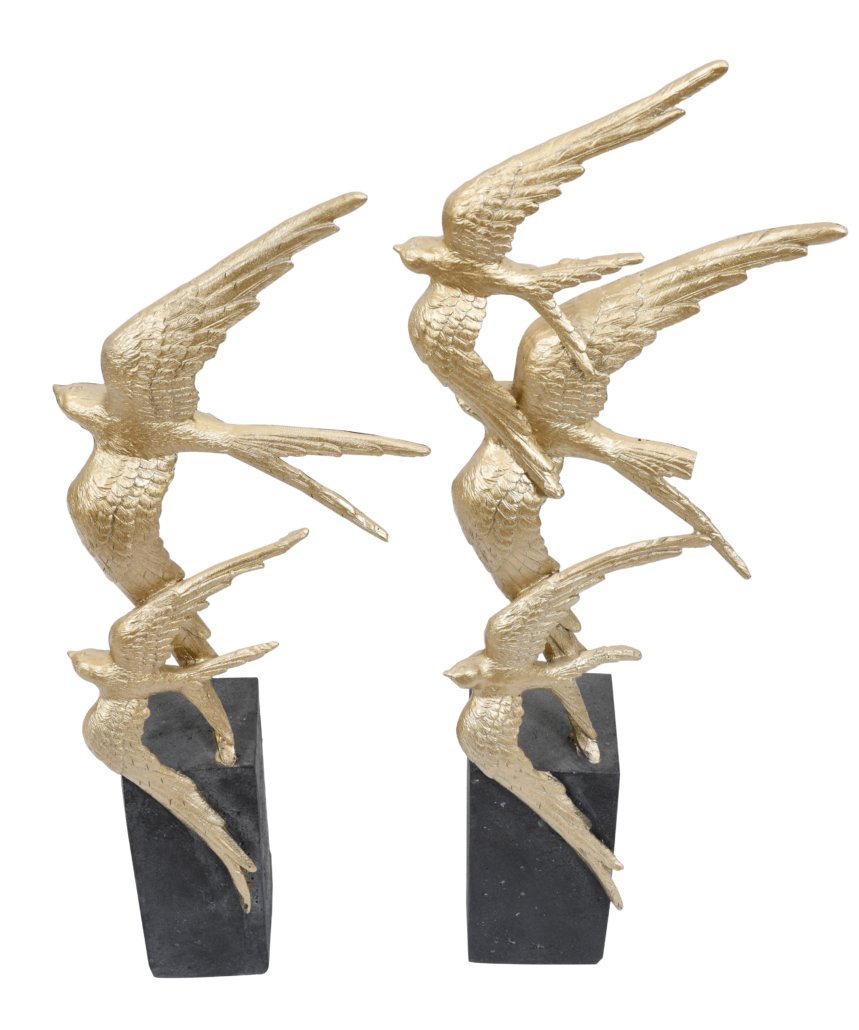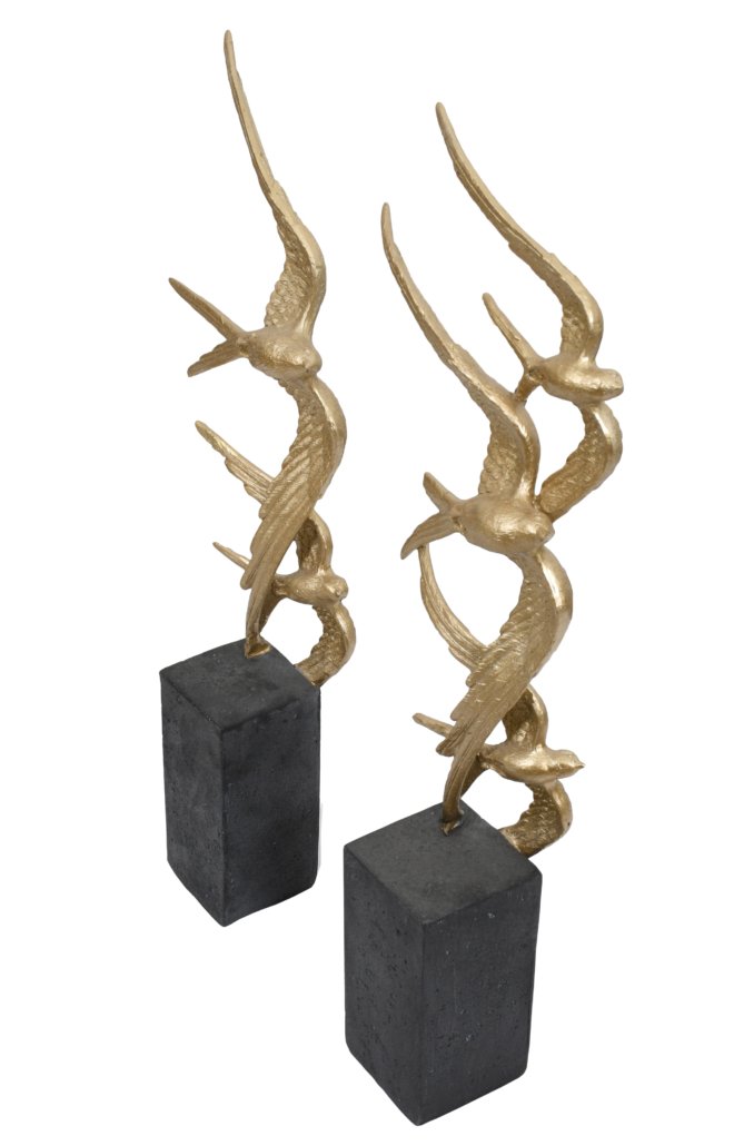 A set of two graduated sculptures of birds in flight. Constructed in resin, each statue is hand painted with the birds receiving a soft gold hue contrasted against the darker base.