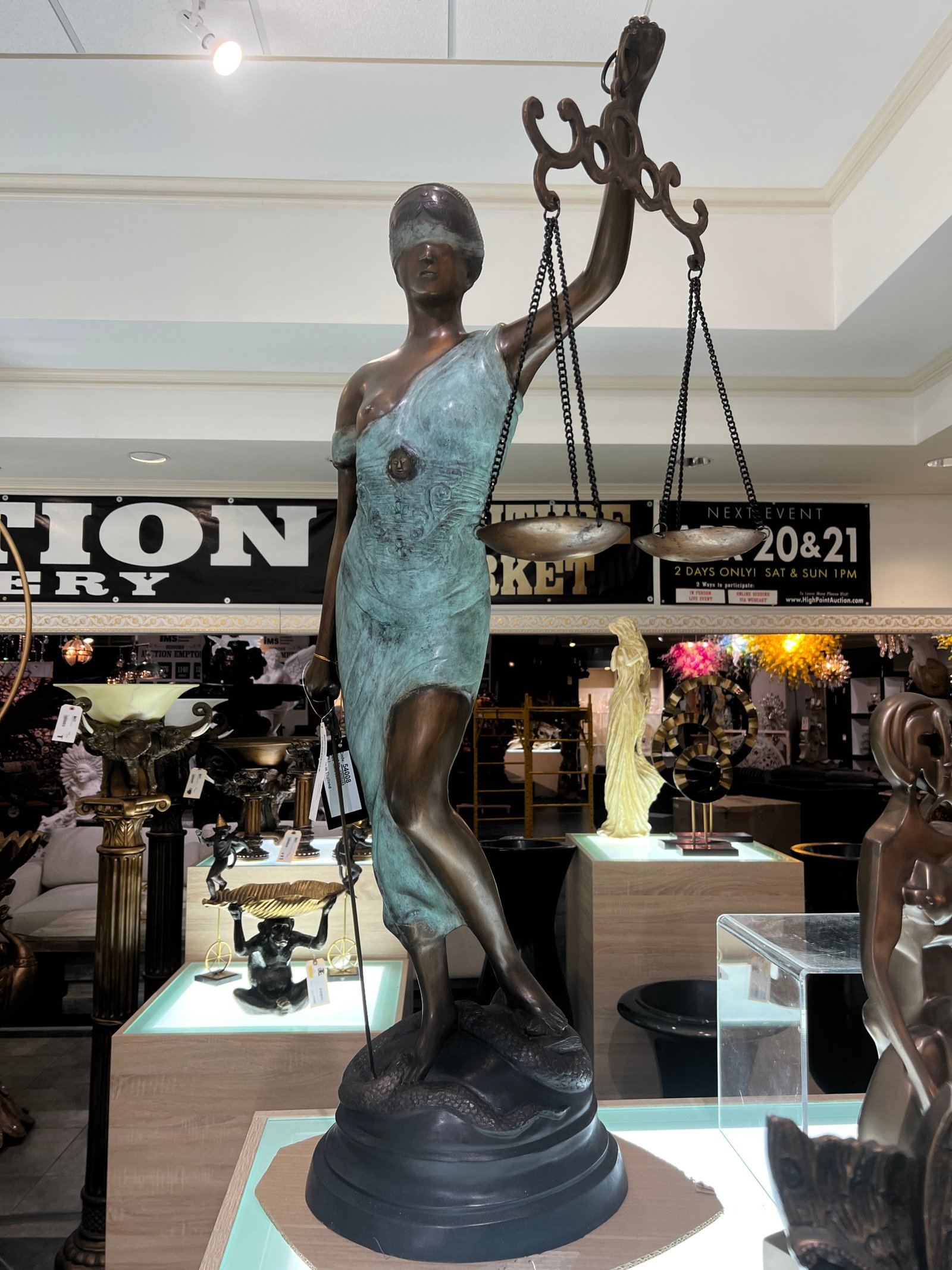 Honor the timeless symbol of fairness and law with this striking Bronze Blind Justice Statue. Standing at an impressive 50 inches tall, this detailed sculpture captures the classic figure of Lady Justice with elegant form and powerful symbolism—blindfolded, holding balanced scales, and standing over a coiled serpent of deceit. Crafted entirely from bronze, this piece is built to last and commands attention in offices, courthouses, libraries, or as a dramatic focal point in home decor.Let justice stand tall — add refined elegance and powerful meaning to your space with this Bronze Blind Justice Statue.