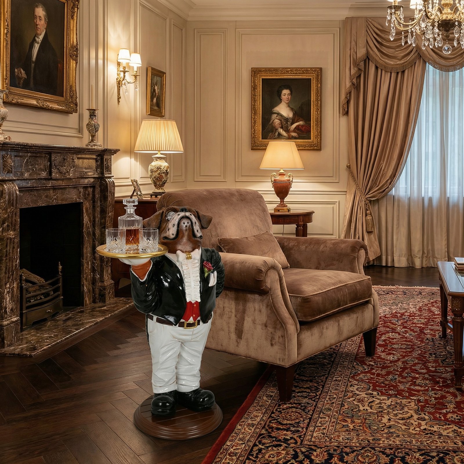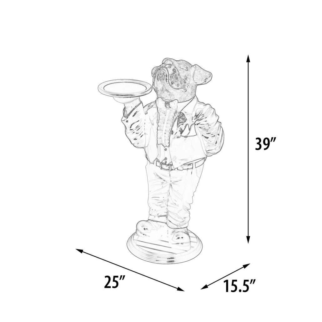 From the enjoyable Whimsical Bistro Buddies Collection we present the Boxer Butler from Whimsical Treasures. This multicolored whimsical butler featuring an arrogant bulldog butler dressed in a tuxedo holding a round gold tray will add playfulness to your rooms decor.