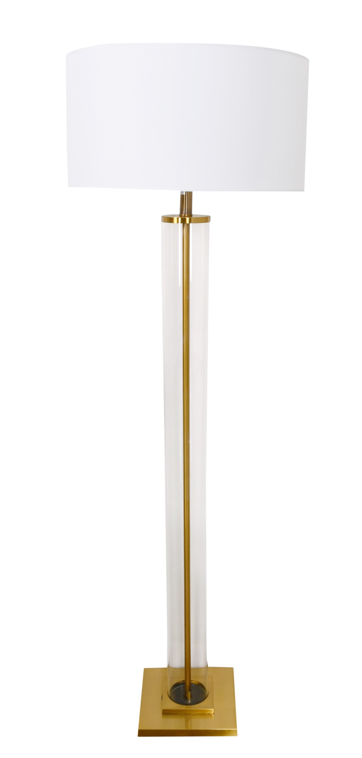 A large floor lamp with glass enclosed center mass accented with brass. Elegant and functional for everyday use.