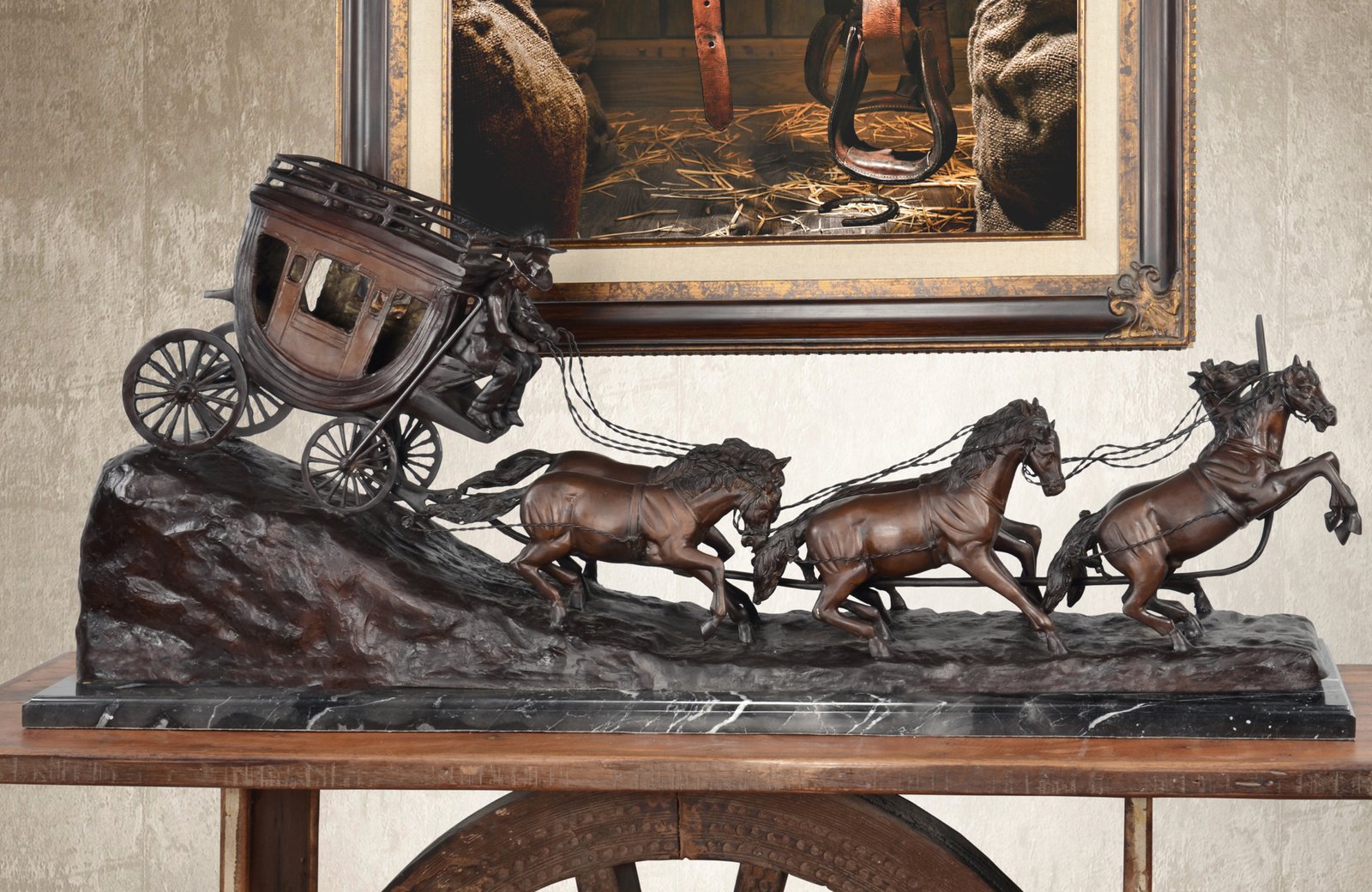 A Bronze Six Up Stage Coach on Marble 51 Inches Wide. A larger mantel or console sized Bronze Creation measuring 51 inches wide X 10 inches deep x 21 inches tall. This classic 6 up rambling stage coach captures the essence of life in the Wild West with its theme, detail, and the movement the sculpture exhibits. Artist finished inappropriate hues of brown patina for enhancing detail sits atop a Black Marble Base. A 100 percent Lost Wax Cast Bronze sculpture from Timeless Creations Collection, a division of AFD Home. Bronze, , as a favored metal , allows the artist to create these types of depictions in a higher level of detail as well as offering a metal that does not rust. Bronze, primarily made of Copper, has collectible value and will last forever. Consider adding this to other Western offerings for an enhanced collection and decor. Hand Cast and Finished by talented Bronze Artists in Thailand. No Assembly Required