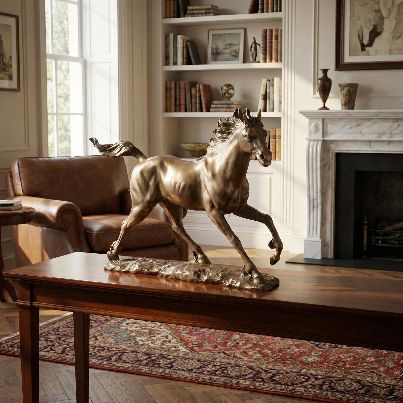 Our Bronzed Galloping Horse at 21.25″ wide x 4.75″ deep x 14.75 ” tall, is from our popular Platine Metal Series. The original design was Artist sculpted and then hand cast in Polyresin. It features our special and rich Platine metal plated finish. A finish that enables the artists to burnish and polish the details creating a very expensive looking yet affordable decorative art sculpture.
