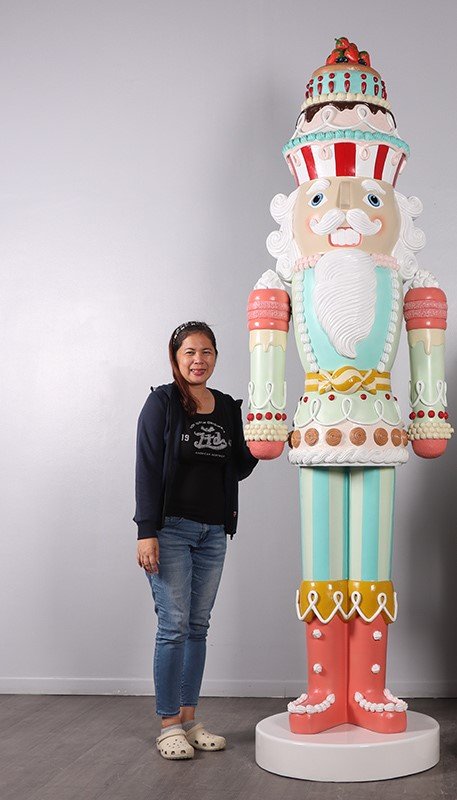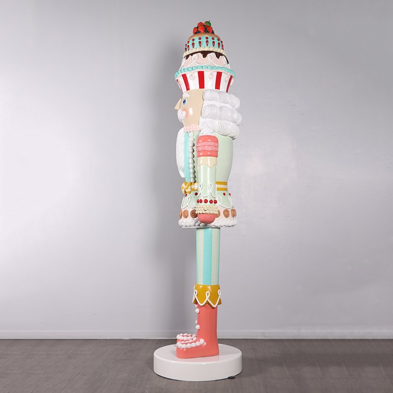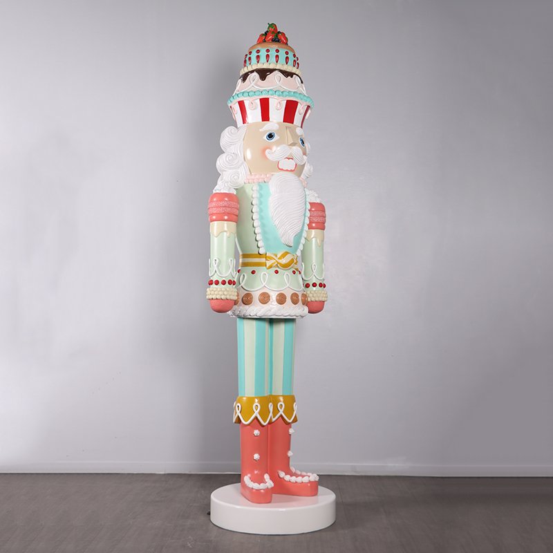- Standing 9ft tall this amazing holiday statue is for the BIG HOUSE! Easy to assemble with a huge look and size this cool Christmas Decoration is entirely hand painted bringing the piece to life with vivid color. Suitable for commercial purposes the Candy Cake Nutcracker is contructed in durable fiberglass that will stand the test of time. For storage purposes the nutcracker breaks down into several smaller pieces making it easier to find space. Go big this holiday with the 9ft Candy Cake Nutcracker. Please note that while fiberglass will not have any issues outdoors the painted finish of the statue needs to be protected when outside. Try to avoid direct sunlight to avoid fading or apply a clear coat sealant to seal and protect the finish