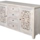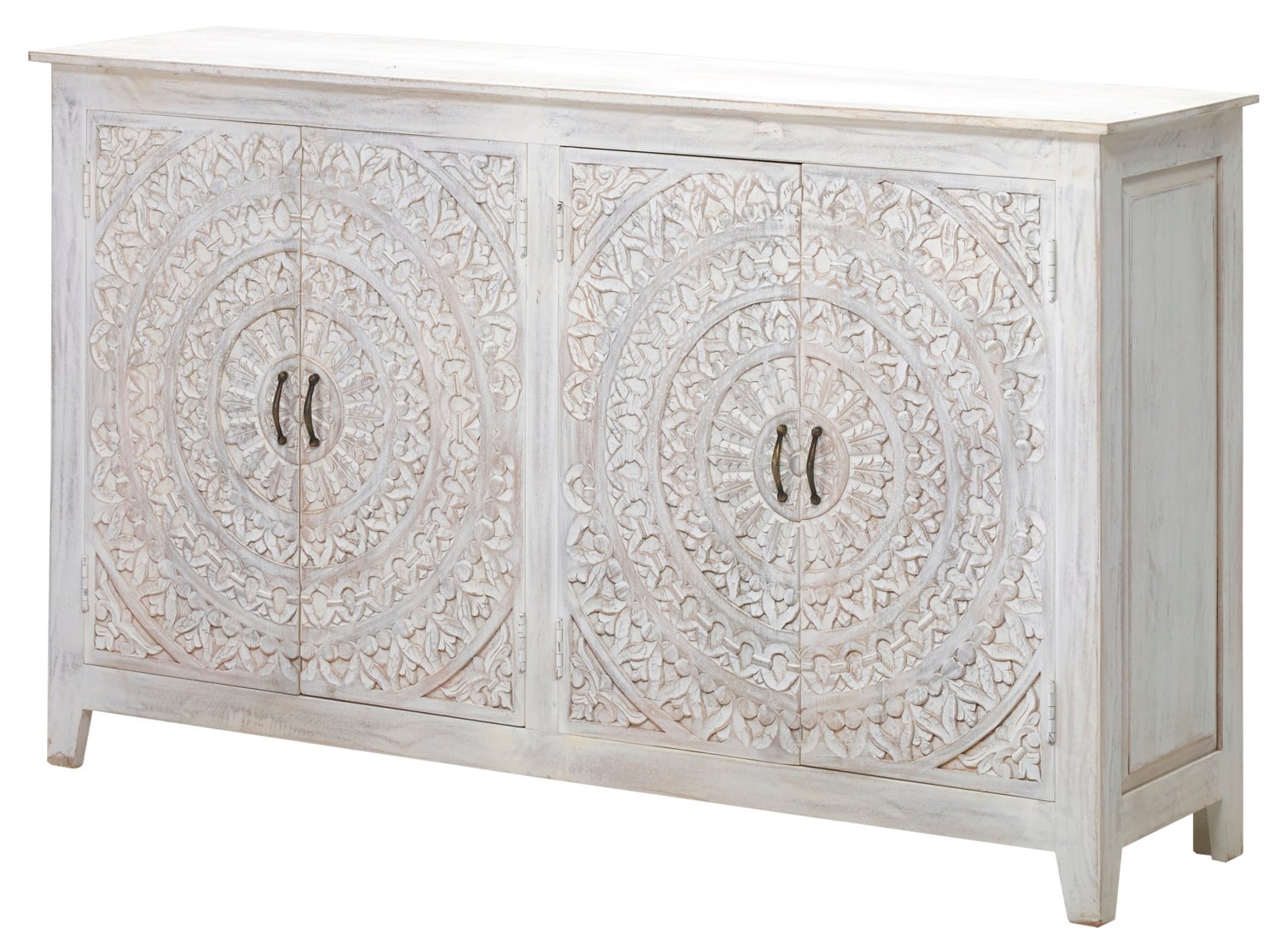 Carved Lace 4 Door, Cabinet Sideboard, Credenza, Entertainment 68 Inches offers versatility in placement and Fashion. This could easily be used in the bedroom as it offers shelf storage and a perfect base for a Big TV. it is a part of the Carved Lace Bedroom Collection. It is often sold separately because of its popularity as a stand alone unit that is placeable in designs from a Casual transitional styling to a perfect match for lots of Coastal or Farmhouse trends. It is made in solid wood, the carved lace design is Hand Carved. The cabinet features 4 large carved doors that open to expose concealed shelves. The finishing is a painted white wash. This style is very unique with the focus of the set being on the Carvings. Search for all the Carved Lace Harlow Bedroom Collection items from AFD Home and create your perfect room! It is Hand Made and Imported from India for AFD Home.