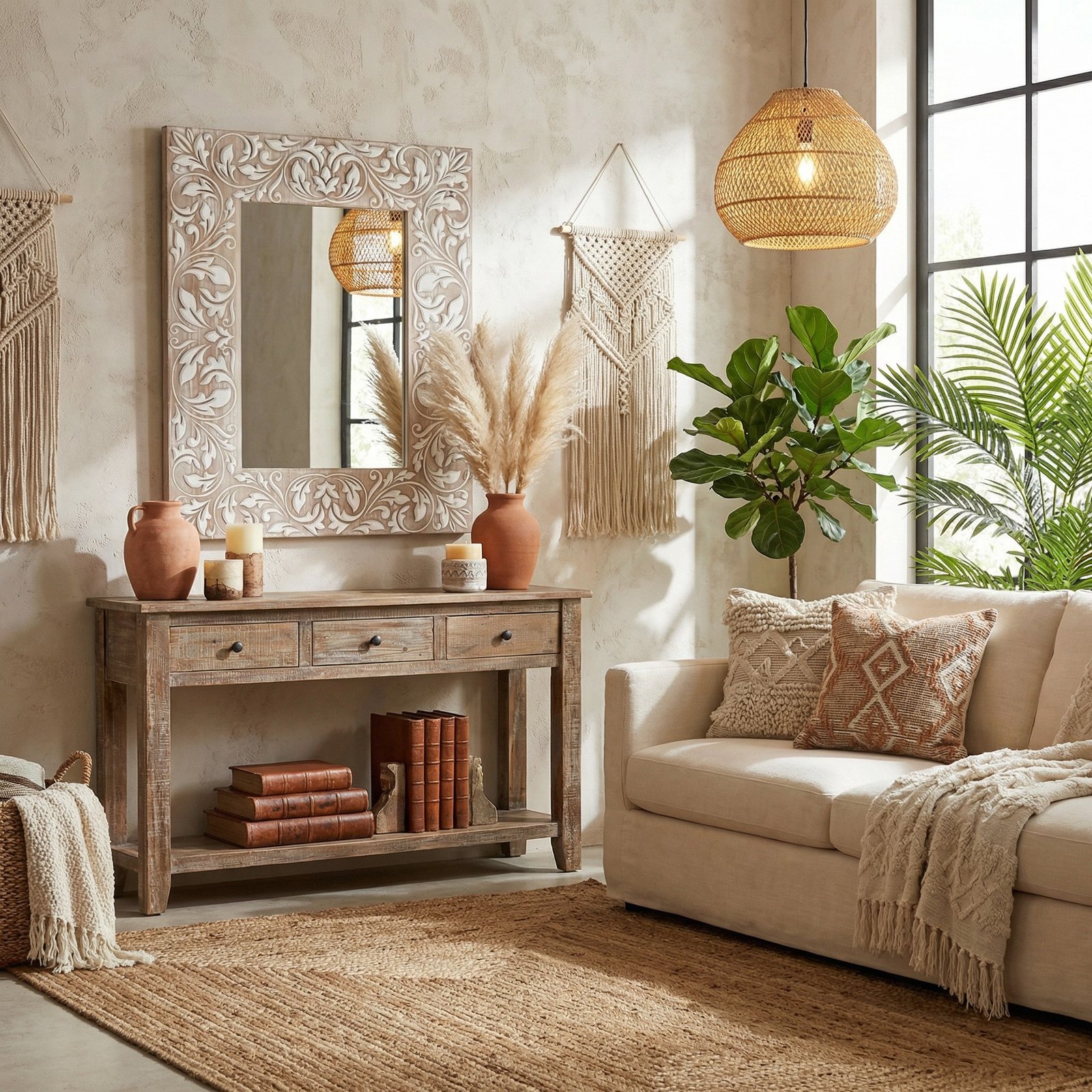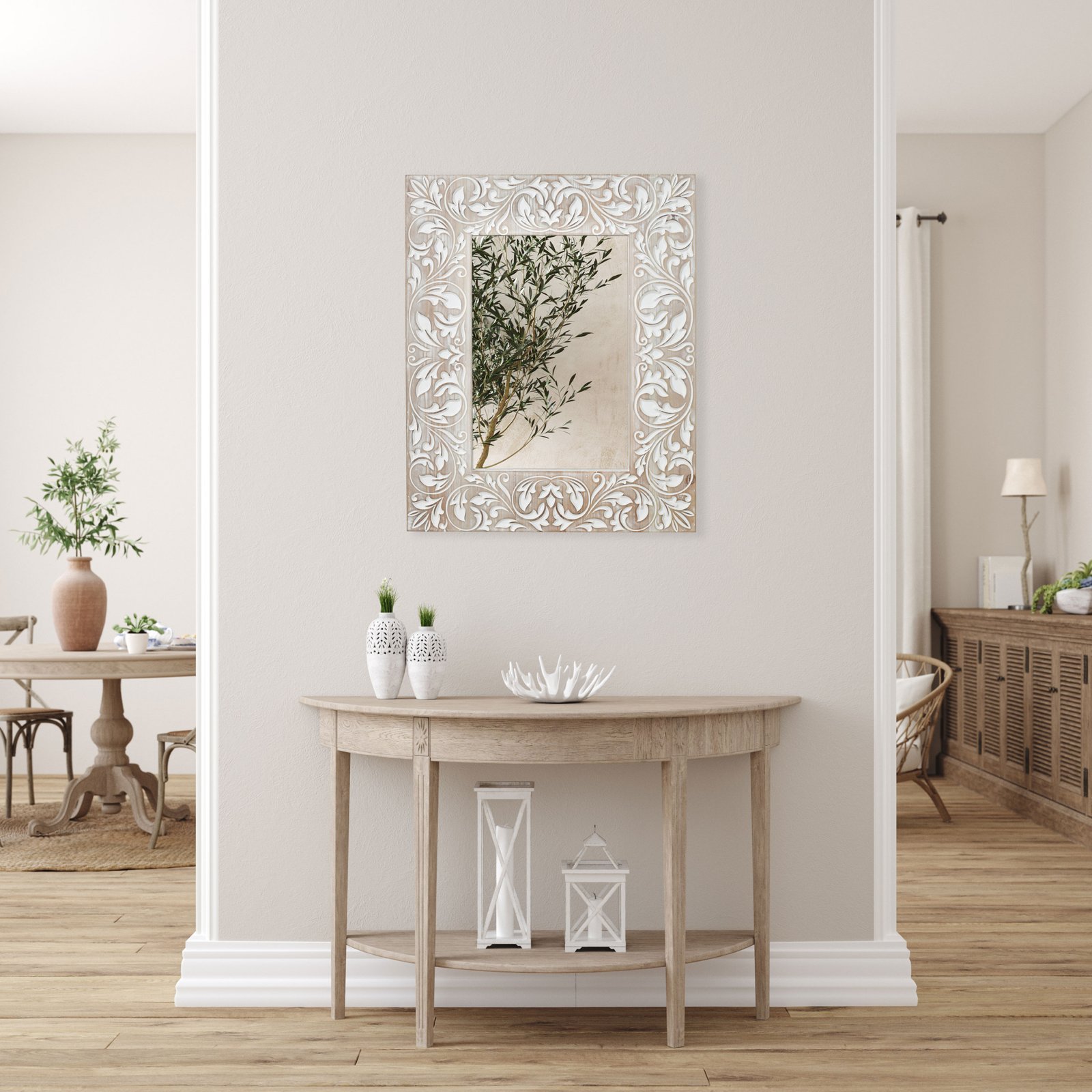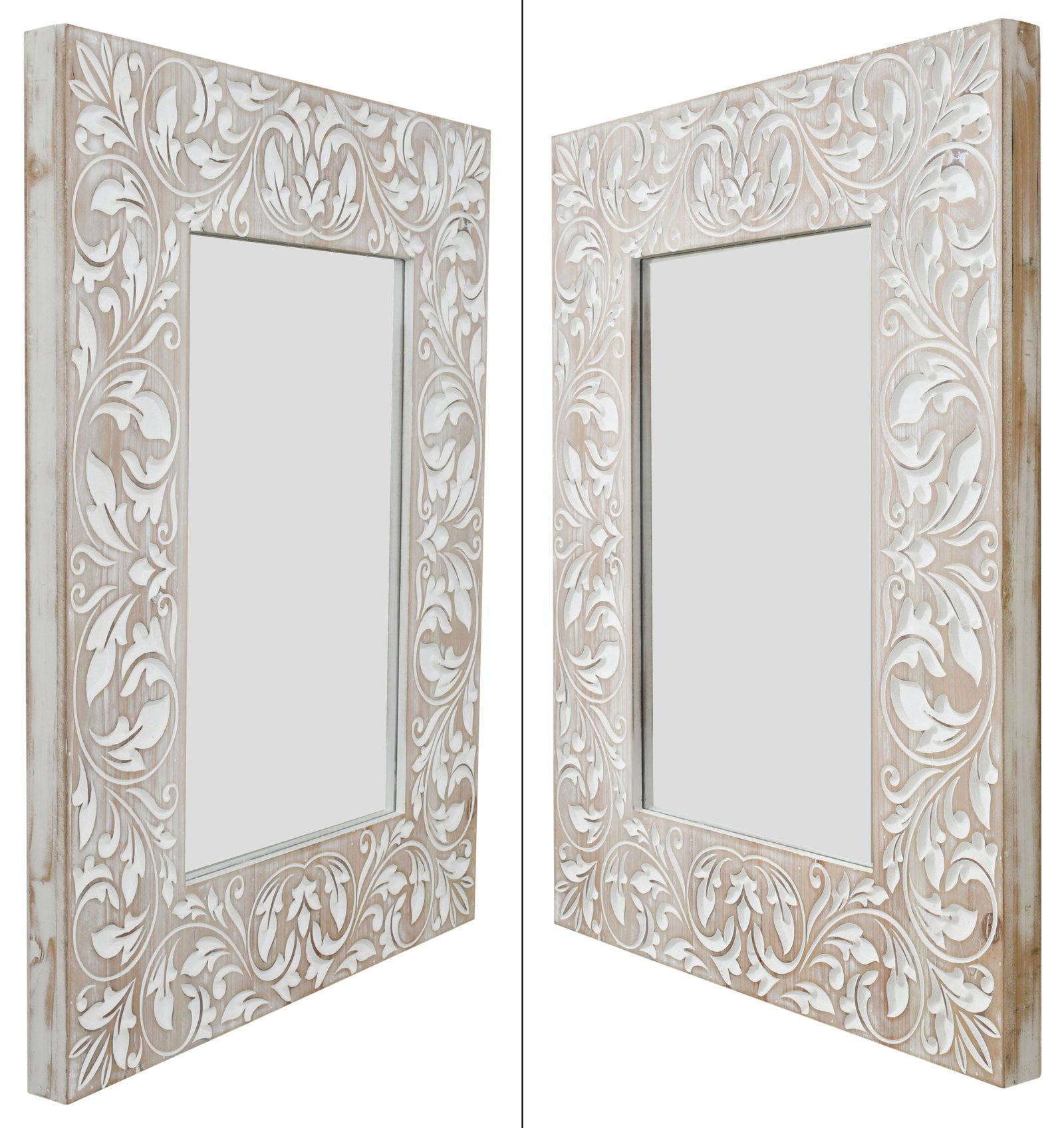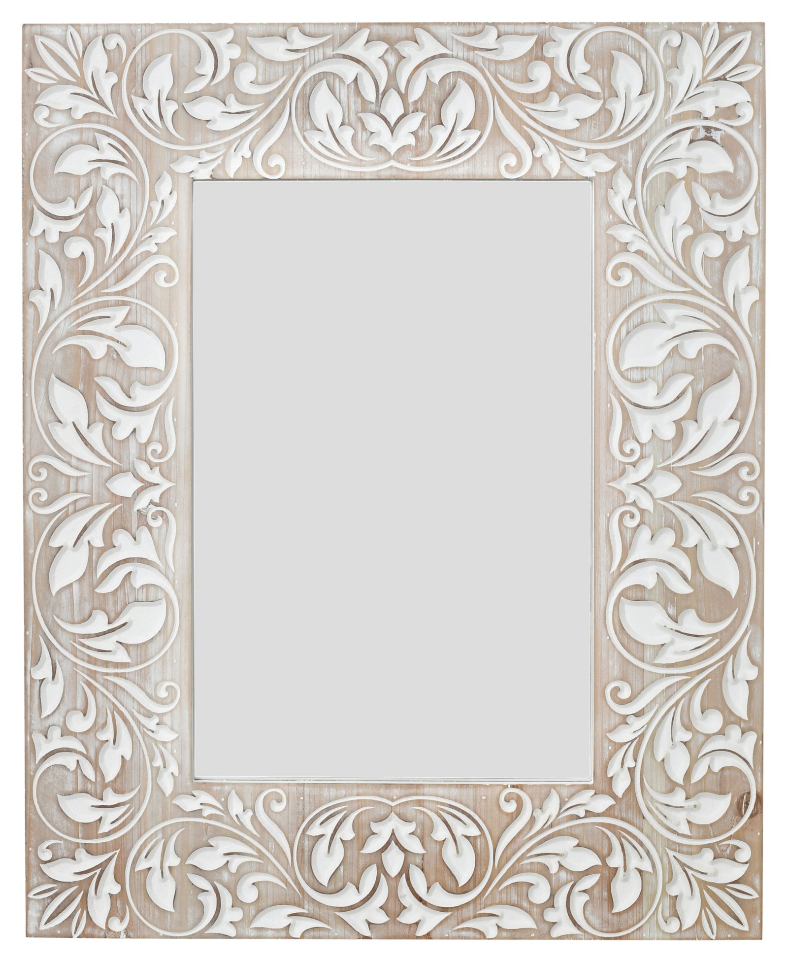 This ornate mirror is a masterpiece of design, featuring an exquisitely carved frame that showcases an elaborate scrollwork of leaves and flourishes. The white-washed finish on the wood frame accentuates the detailed relief, providing a soft, aged appearance that is both elegant and inviting. The central mirror is neatly bordered by this tapestry of carved wood, reflecting not only an image but also the sophisticated taste of its owner. The piece is ideal for anchoring a space with a touch of romantic charm, suitable for classic and transitional interiors alike. Adding to the allure, the mirror brings light and a sense of openness to any room, making it a functional and decorative element. It is a testament to craftsmanship, destined to become a focal point in a bedroom, bathroom, or any living space where the artistry of its design can be fully appreciated.