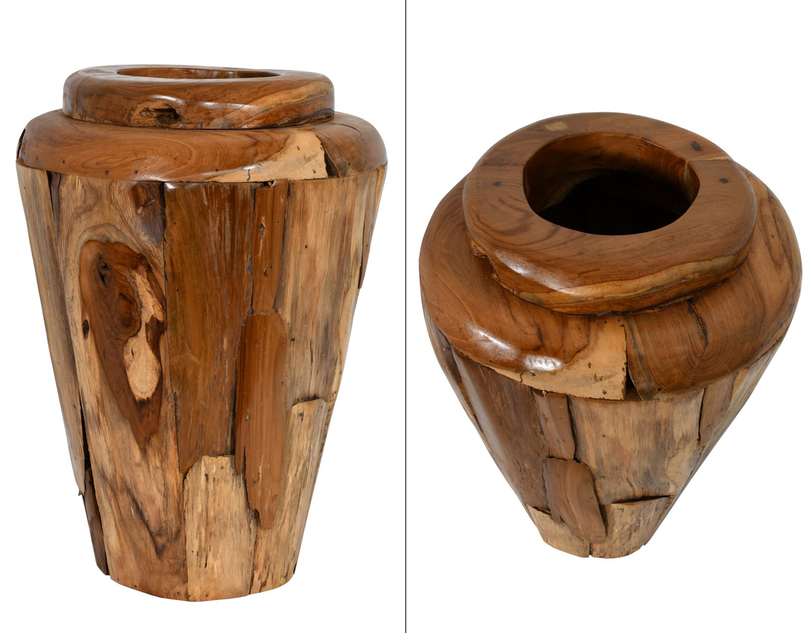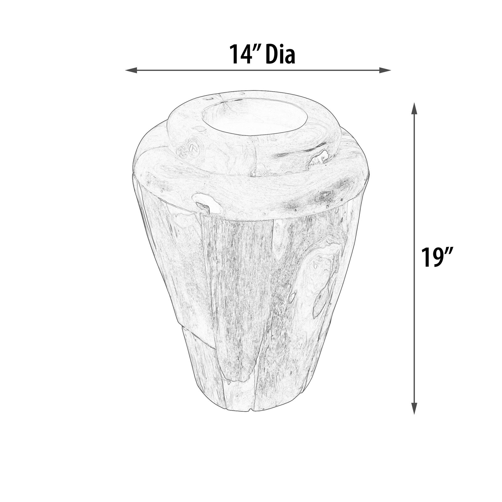 Crafted by hand, each piece of teak root in the 19 inch Teak Vase is hammered into place around the wood frame creating a mosaic styled design. Variations of the grain and natural characteristics of the wood add to the beauty of each Vase while making each unique in their own way. The 19 inch Teak Vase is substantial in size, perfect for larger interior spaces or outdoors. Place the Teak Vase outside to be used as a planter, the natural teak wood will hold up well to watering finding the natural cracks and crevices are good for drainage. Quality craftsmanship and solid wood construction will provide many years of useful enjoyment no matter how you style the 19 inch Teak Vase.