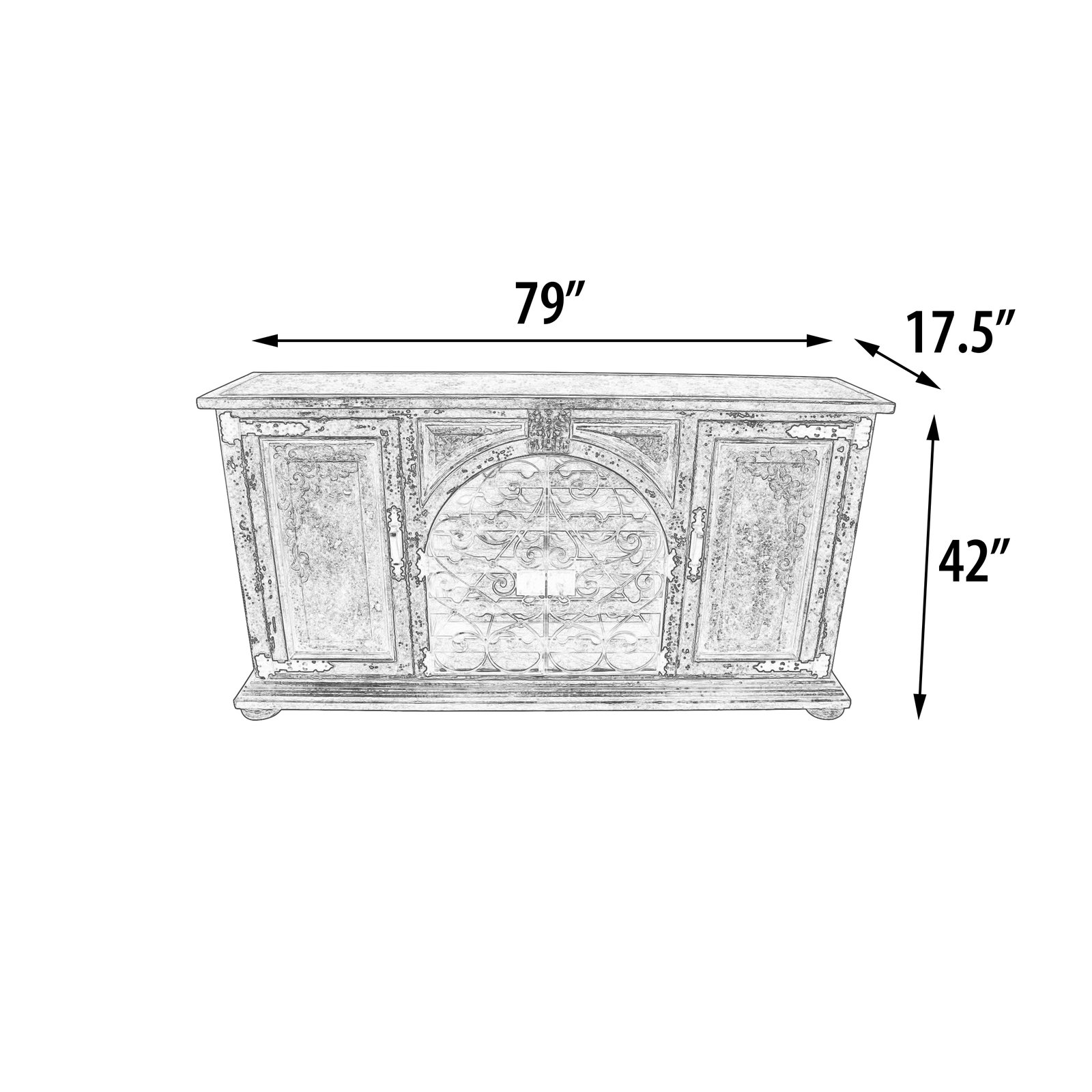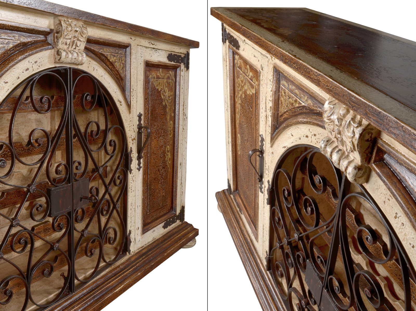 The Casa Grande Iron Wine Sideboard from our expansive Casa Grande Series is 79″ wide and 42″ tall. It features hand forged iron arched doors with hand hammered locking hardware and key, that enable a secured yet visual display of its contents. This collection boasts a Spanish influence with its large scaled details in a popular finish of deep rustic browns featuring a contrast of distressed creamy whites and delicately detailed with hand painted soft scrolls. Consider pairing with other Casa Grande offerings from this series. The Casa Grande series is part of our Santa Lucia Collection consisting of handmade, hand painted, and distressed solid wood furniture making each piece a timeless investment. Hand crafted treasures made one piece at a time, under one roof, by our exclusive family owned manufacturer from Lima, Peru. Their master artisans are skilled in furniture making techniques influenced by the Spanish during the colonization of Peru. Many items in the diverse collection feature specialty hand painted finishes that have also been passed on and perfected from generation to generation. The family strives to be environmentally friendly by using woods re-purposed from haciendas and old colonial homes as well as wood indigenous to South American forests, primarily mahogany, cedar, mean and requia. If you are a lover of beautiful painted furniture, find hill country rustic romantic, or find richness in Mediterranean lore Then you too may fall in furniture love with this fine collection.