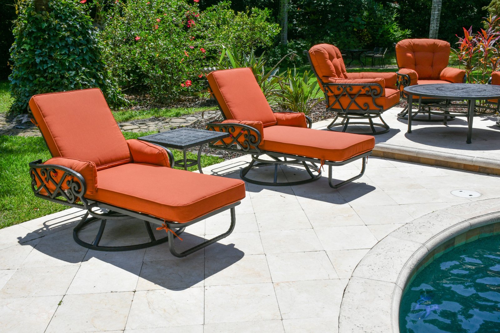 The Chillounger Swivel Chaise Loungers and Side Table set of 3 create an extended even more relaxing seating option. A very comfortable lounge set collection with plush seat and back cushions and a beautiful accompanying table to create a stylish seating area. Set of 3 Includes: 2 Sku # 12008203 Chillounger Swivel Chaise Loungers 82W X 22D X 38H 1 Sku # 12009944 Chillounger Side Table 24W X 24D X 22H The first ever 360 Degree Swivel Chaise Lounge is also one of the most comfortable seating Chaise Lounges in the market. Bridgeton Moore with it’s Chillounger Collection embraced the social trend of high end super casual outdoor furniture this Chillounger Chaise takes casual outdoor lounging to the next level. WARNING Our Chilloungers our not for seating…… they offer the ultimate casual comfort causing a new sport of CHILLOUNGING to take over customer’s Back Yards. You cant just sit, you climb in, curl up, relax and melt the weeks stress away in your soon to be favorite super plush, super deep, super wide comfortable Chillounger chaises and chairs. The Chillounger offers a beautiful bent ,forged and hand hammered scroll design that is finished in a rich brown bronzed tone with hand highlights that accent the details. The chaises are fully constructed, meaning they are fully welded prior to finishing, the best process to insure long lasting heavy duty stability and simply require assembly of the fully constructed seat portion to the fully constructed swivel base, the table requires some assembly. The cushions are special quick drying foam and covered in a beautiful contrasting Terra Firma Sumbrella Brand fabric, considered among the best fabric for long lasting outdoor use in the industry. Bridgeton Moore has established high brand quality standards and offers one of the best warranties in the Industry, 3 years on all frames and finish under normal conditions, fabrics are all Sumbrella grade and come with a manufacturers supplied two years against any manufacturing defects and or fading from date of purchase. Note: All products used outdoors require reasonable care and that level of care depends on varying external conditions. Covers are recommended for year round outdoor exposure and especially for all coastal applications. Extended exposure in coastal areas can cause corrosion and while this product is used in many coastal applications, they are voided from warranty. Simple hosing down or rinsing off salt exposure if any will protect and extend the beautiful finish. The fabrics can be easily cleaned in a variety of ways and Sumbrella fabrics are so colorfast they can withstand even the use of bleach. Some Assembly Required