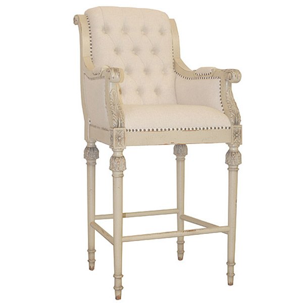 It would be hard to imagine a more elegant hard carved Continental Linen Bar Stool – PM. These bar stools are substantial stools that offer an attractive rolled tufted back in an upholstered plush beige linen front back and seat cushion. The chair design offers a more relaxed continental style with delicate hand carved details. The bar stool shown is finished in our elegant Parchment Multi finish (PM) and our sold separately. The seat height of these stools make these appropriate for conventional 42″ to 44″ bar height seating , for conventional kitchen counter or gathering height table use, order the Continental Linen Counter Stools-PM. This design is also offered in the equally as beautiful Heritage Vintage Estate-VE finish. These popular stools are beautiful and comfortable and are offered from our Heritage Collection. A collection of turn of the century styling designed and scaled to showcasing American Standards. The Heritage Collection is a fine hand made furniture collection in the purest of standards of age old traditional crafting. Each piece is hand carved one piece at a time by some of the worlds best carvers. The special Mahogany wood used comes from replanted forests, the selected wood has been kiln dried. The item in its final form is stress and pressure tested prior to finishing to insure long lasting stability in most all climates, a Heritage Brand standard. The final steps of hand making furniture is the application of the hand applied finishes. The specialty finishes used combine hand applied layering, glazing, padding ,distressing and crackling techniques and complete the beauty and value of owning timeless Heritage Furniture, a quality that will last for generations of ownership. Made in Indonesia.