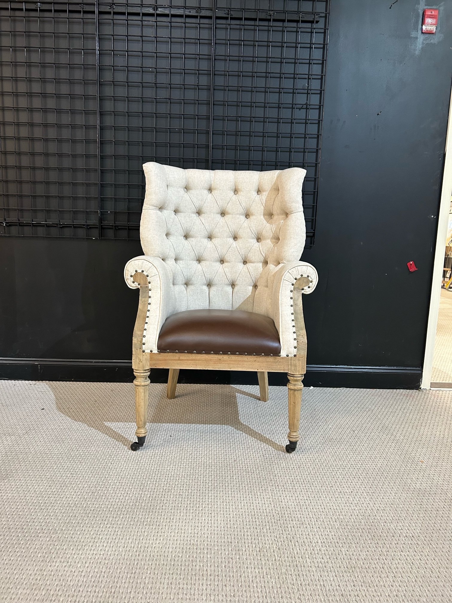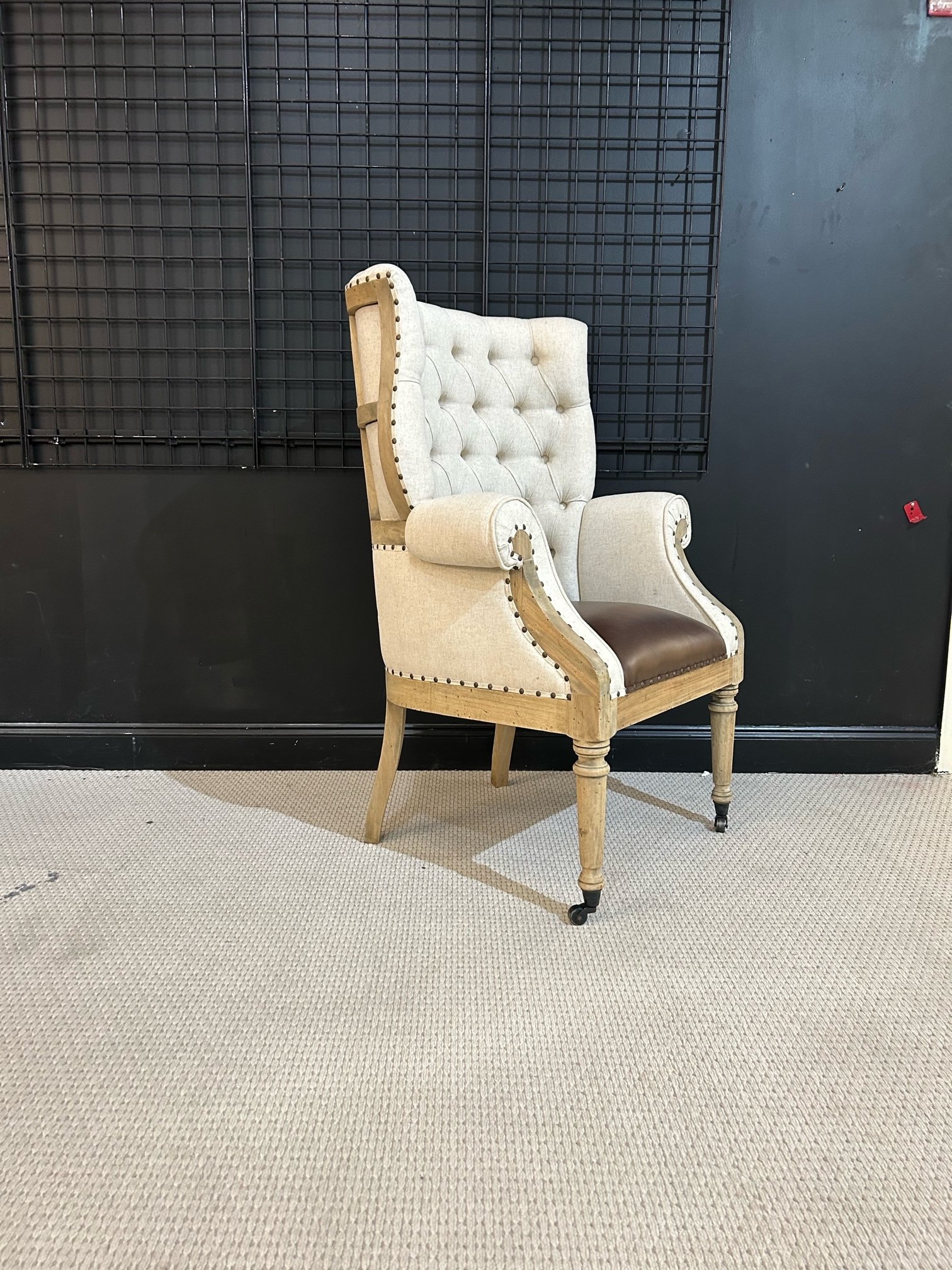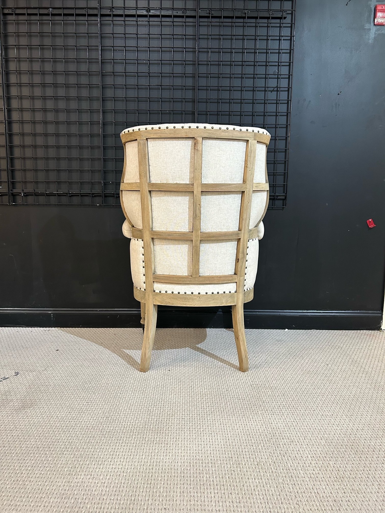 Bench made; the Country Armchair is constructed in solid pine. The pine is bleached and seasoned, making sure that the natural variation of the wood becomes a part of the style. Upholstered with Leather and Linen accented with nail heads, the Country Armchair will make a beautiful addition to your home.