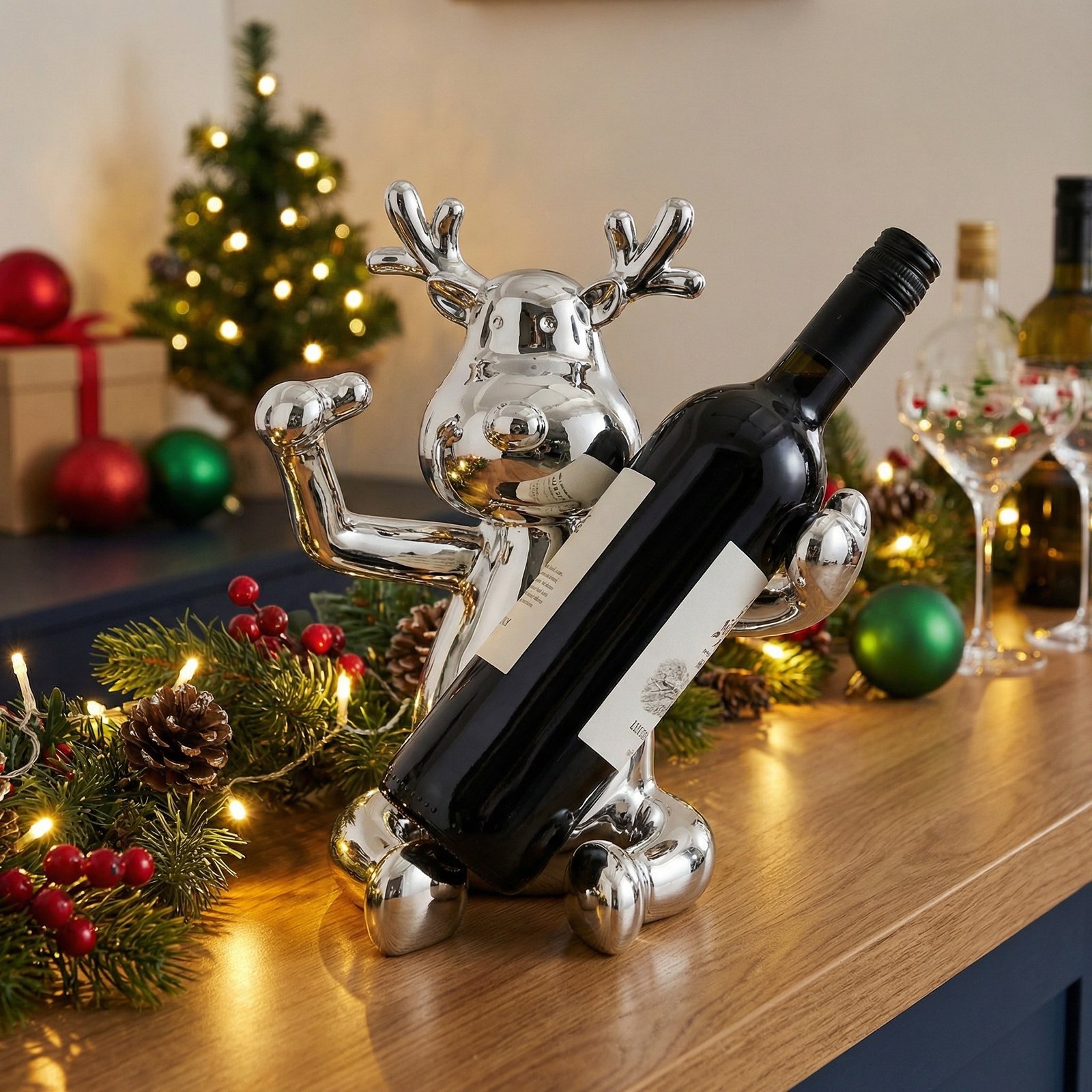 Perfect for the counter, table, or bar this bright and shiny silver deer will hold your wine and enrich your table setting.