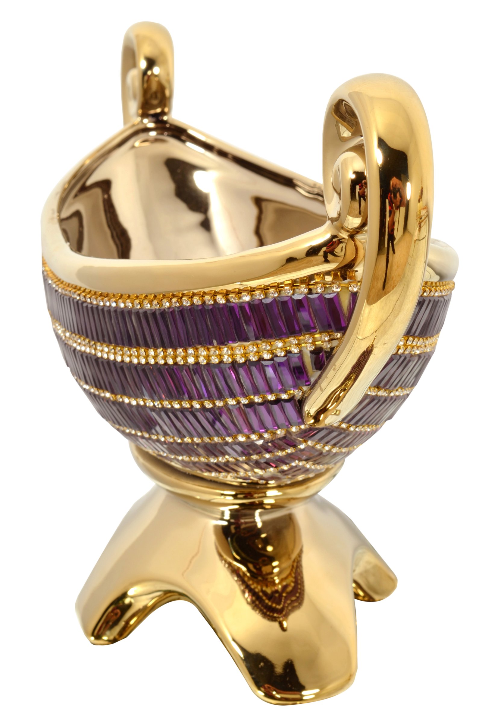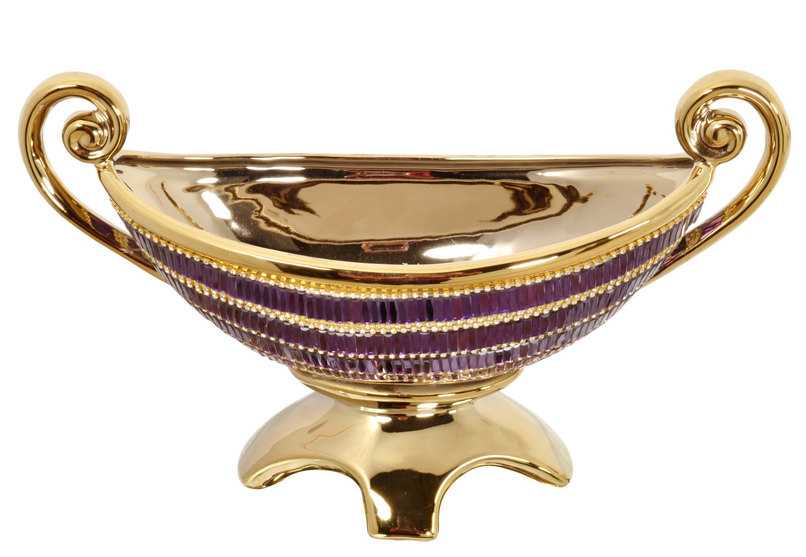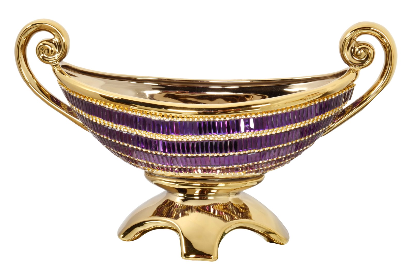 The 16.9 inch wide Duchess Bowl is a stunningly beautiful oval center bowl. It is hand cast in porcelain and Gold Metal plated. Features hundreds of individually hand applied purple and clear rhinestones. The intense depth of the purple color and the contrast created with the clear accents and gold plating all combine to create a stunning effect on this handcrafted decorative item. Consider adding this to other Duchess series items for a larger display affect. No Assembly required