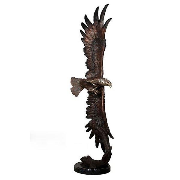 A 50″ tall powerfull vertical depiction of the American Eagle in flight as if to be sailing in full control of the skies from which the Eagle reigns supreme by the David Foundary. This foundary specializes and is recognized by the quality of the action of the Timeless Creations the artists sculpt and also the unique finishing. Cast in lost wax bronze. The finishing is a beautiful combination of multi tones of walnut patinas used to draw attention to details further work is done with silvering of the mane and tail feathers and polishing to shining detail the beaks and talons. Recognized as one of the top foundries for this type of art.