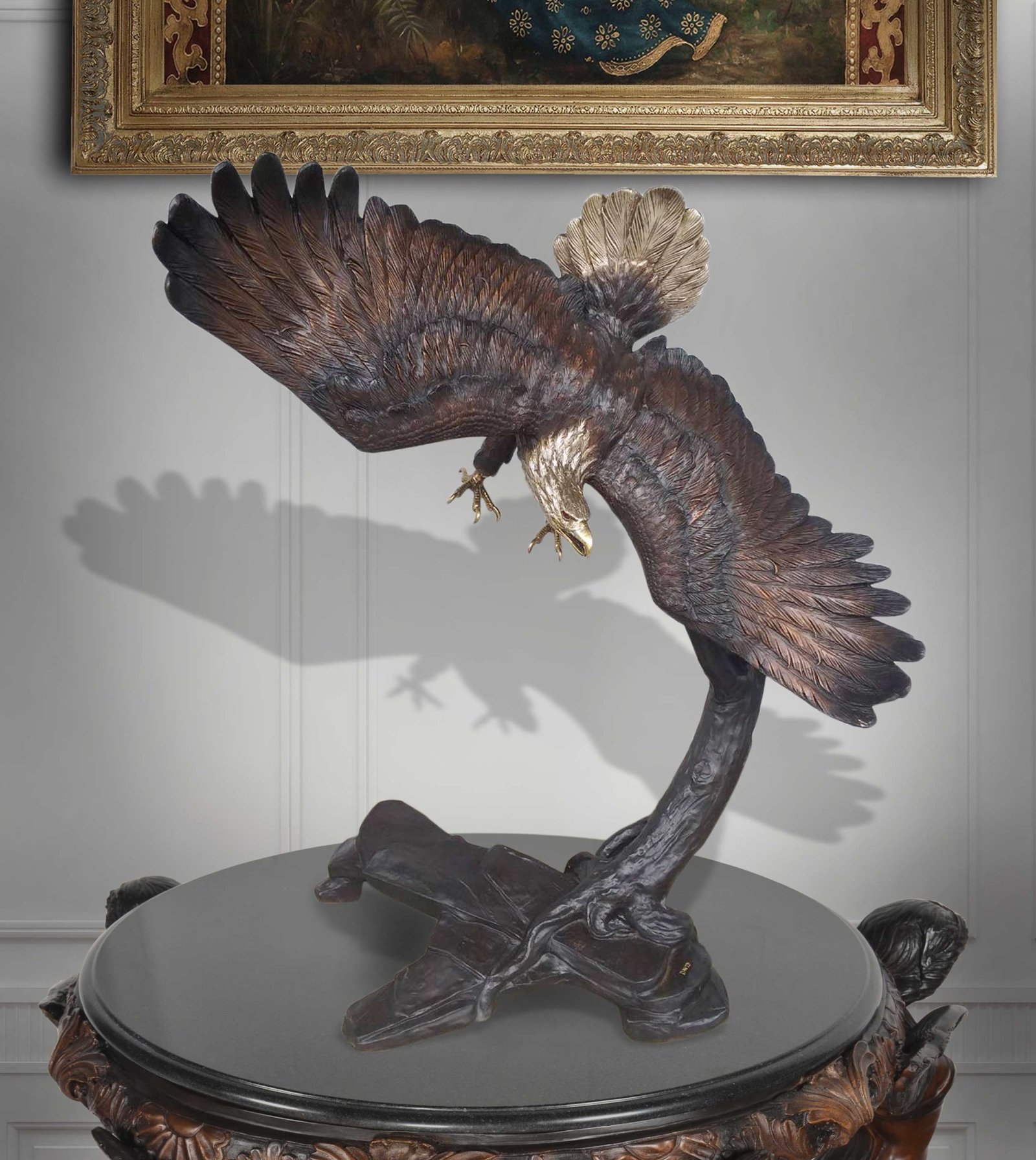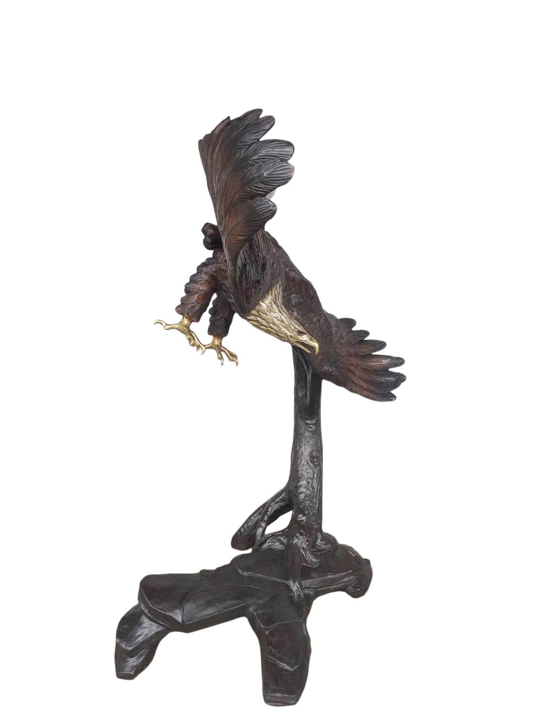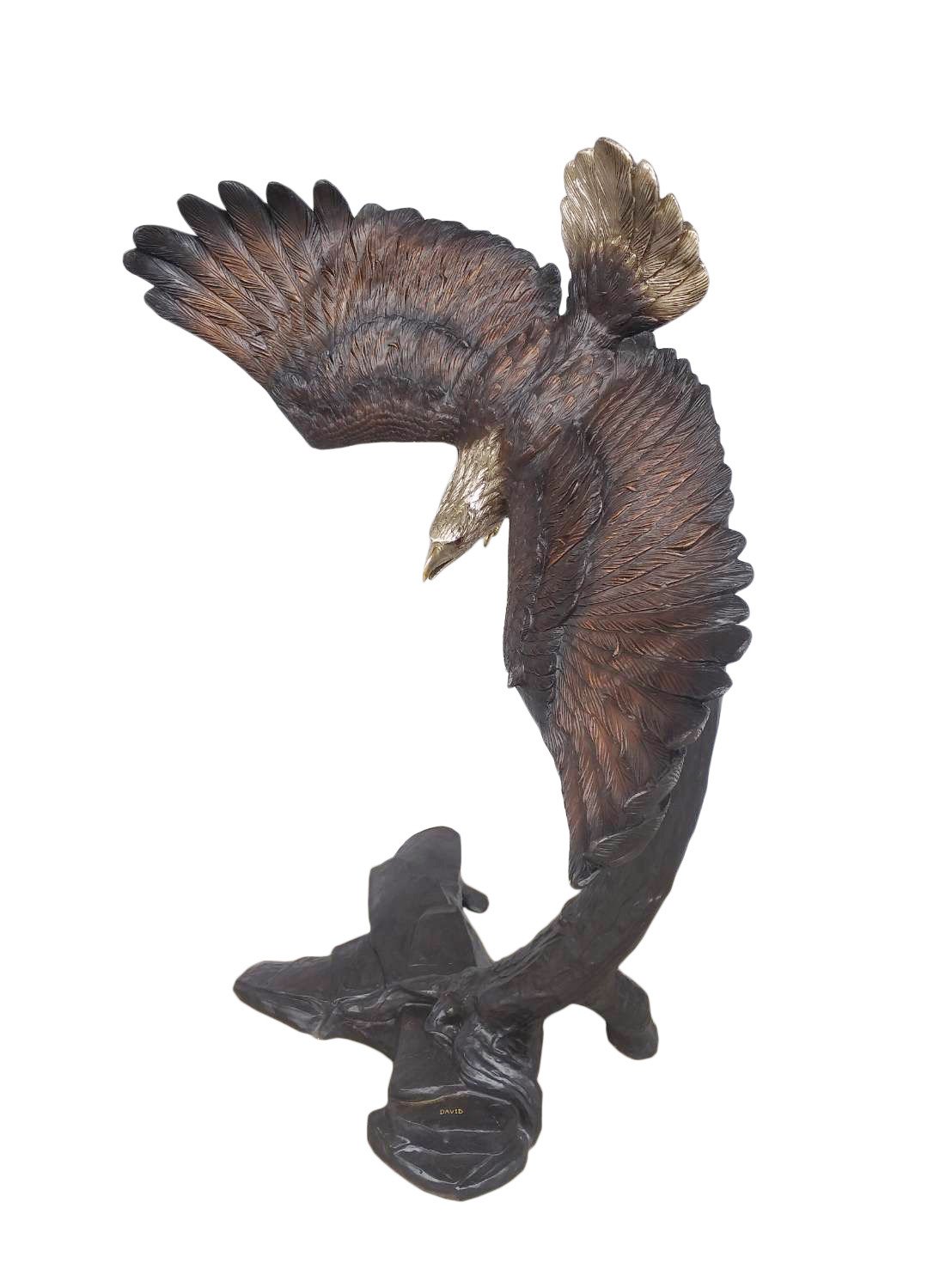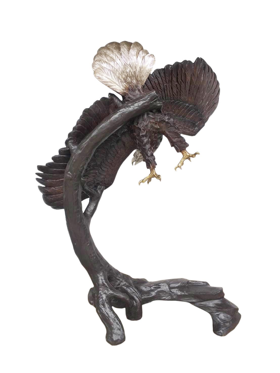The Bronze Eagle Flying Right 64 Inches Tall is an Artist created creation from the David foundry. Specialists in Audubon subjects and is especially renowned for his Eagles sculptures. In this beautiful offering, the artist depicted the free flight movement of this majestic Bird by subtly incorporating a tree detail for natural support in the background. While it always exciting to capture a view in a natural setting, it can be even more impressive to own this life size heirloom creation. This statue is 100 percent authentic hand cast bronze in lost wax molds by the Timeless Creations Collection by AFD Home. Bronze is suitable for Indoor or Outdoor use and will virtually last forever. The finishing is a beautiful combination of multi tones of walnut patinas used to draw attention to details. Further work is done with silvering of the mane and tail feathers and polishing to shining detail the beaks and talons. The Eagle has been the United States’ national emblem since 1782 and a spiritual symbol for native people for far longer than that. Consider creating a dramatic Balance by adding The Eagle Flying Left 63 Inches Tall, which creates a very powerful entry statement. It can also be combined with other North American Animals to create a bigger collection. Hand Crafted by the Talented Bronze Artists in Thailand. No Assembly Required