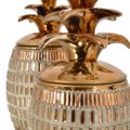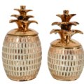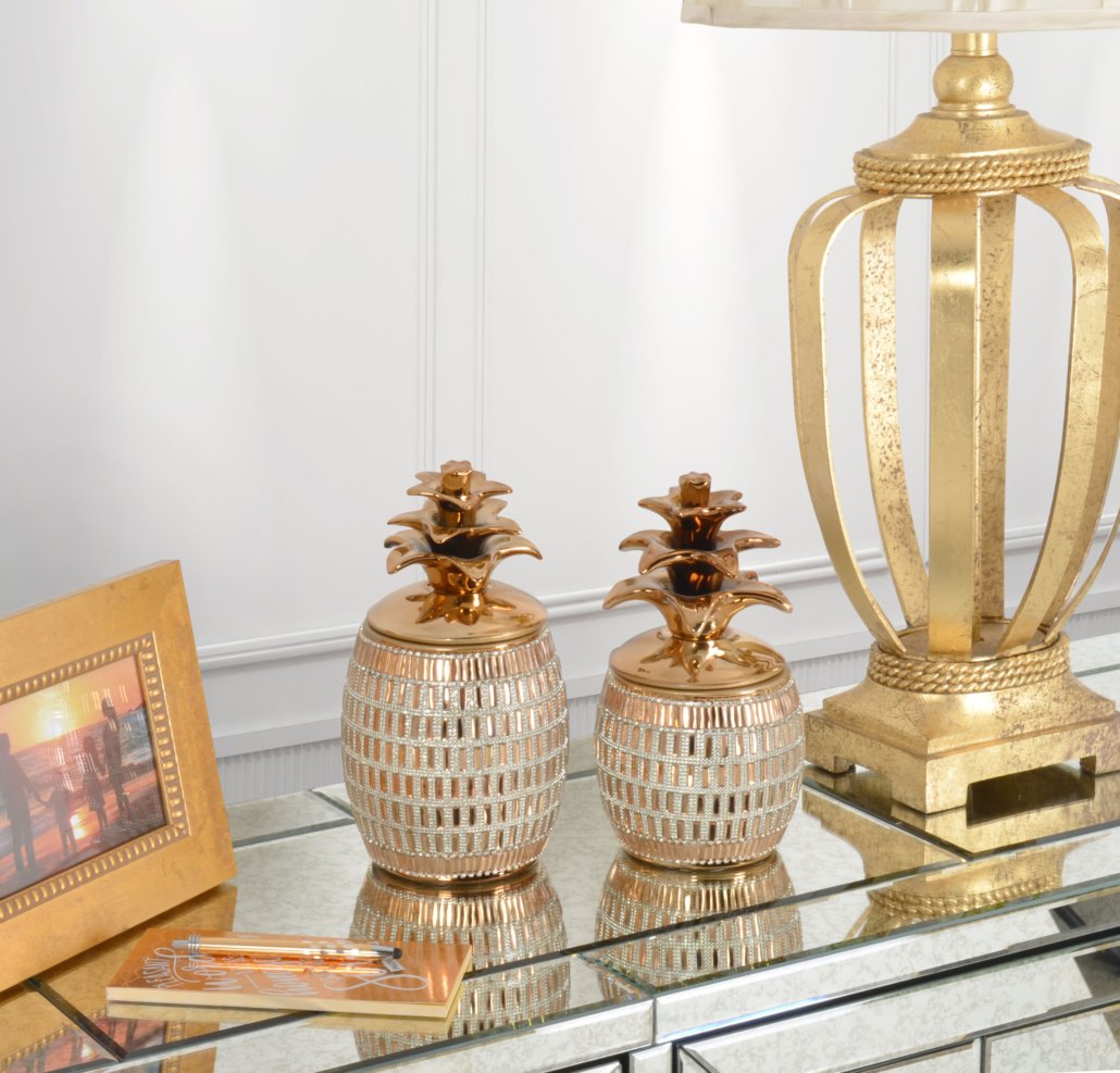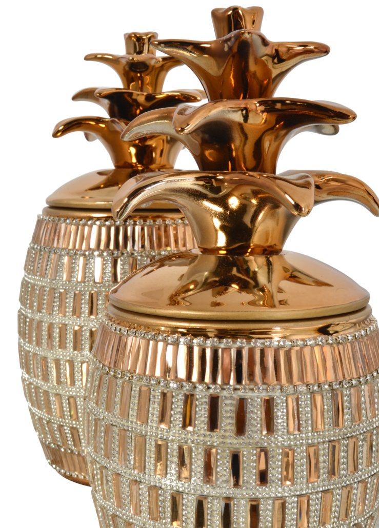 The Empress Keepsake Cannister Set of 2 offers a beautiful decorative set that also offers functional storage with removable lids. The Pineapple is a symbol of hospitality and a welcome design in many decors. The Items are Hand Cast in Porcelain. The porcelain is richly plated in warm Gold, further enhanced with Amber, and Clear hand applied rhinestone crystals. Consider combining with other luxurious items from the Empress Collection. Makes a Great Gift.