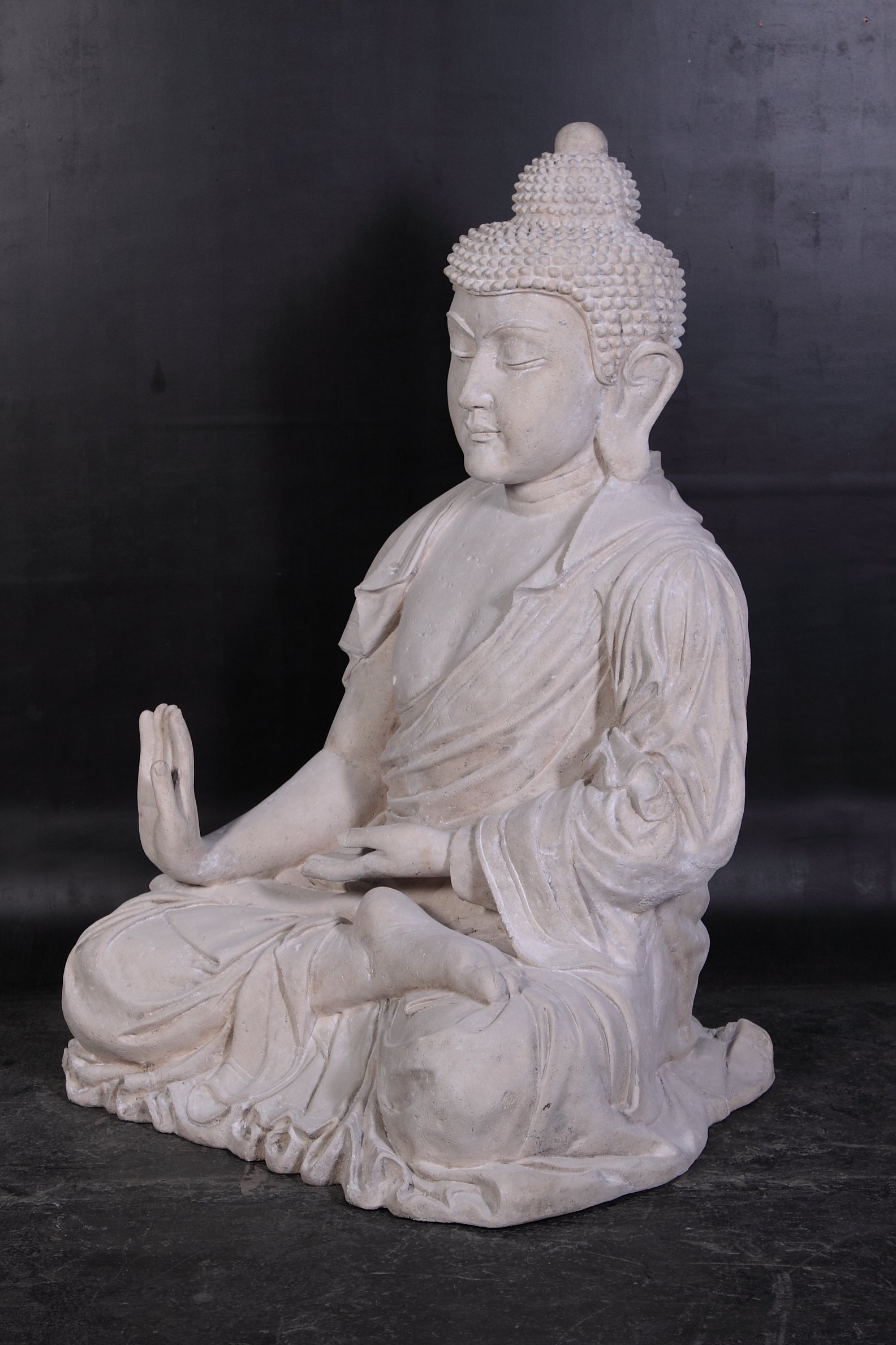 The Enlightened Seated Buddha 4ft in Aged Stone Finish measures 34 inches wide X 32.25 inches deep X 47.75 inches tall. Buddha, the Enlightened One, a seeker of Truth and the meaning of life, was a philosopher, mendicant, meditator, spiritual teacher, and religious leader who lived in Ancient India (c. 5th to 4th century BCE). He is revered as the founder of the world religion of Buddhism. Humble and Loveable, he left his palace life to follow the path of the wandering holy man. Hand Cast in durable Fiberglass reinforced sandstone. Our Buddha has a lightly aged rough stone finish. The item is suitable for outdoor or indoor use and creates a spiritual centerpiece for a peaceful garden and place for you to ponder and appreciate life. Brought to you exclusively by AFD Home. Hand Cast and Hand Finished in the Philippines. No Assembly required