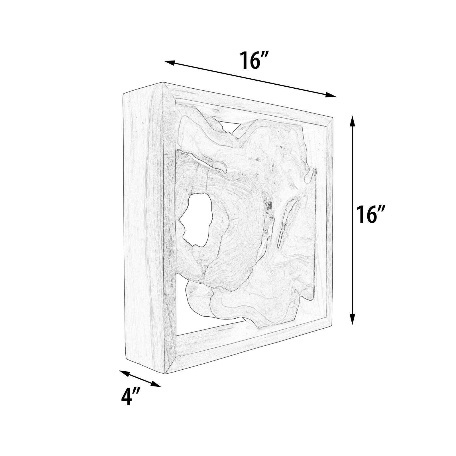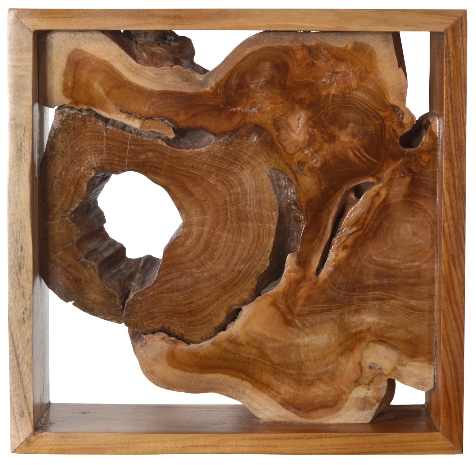 - Each piece of floating teak in wood frame wall decor is handmade measuring 16 inches square. Natural teak is cut into slices exposing the grain of the wood making each unique. The slices are then framed leaving pass through openings that create the look that the wood is floating in the frame. Use multiple framed pieces of floating teak and create larger wall displays for a feature wall, the warmth of the wood is a nice compliment for any space needing natural inspiration.