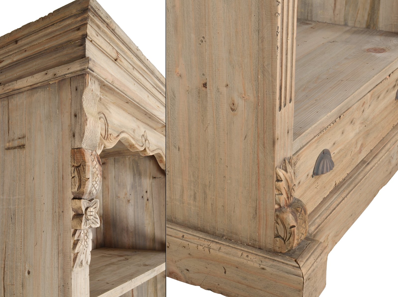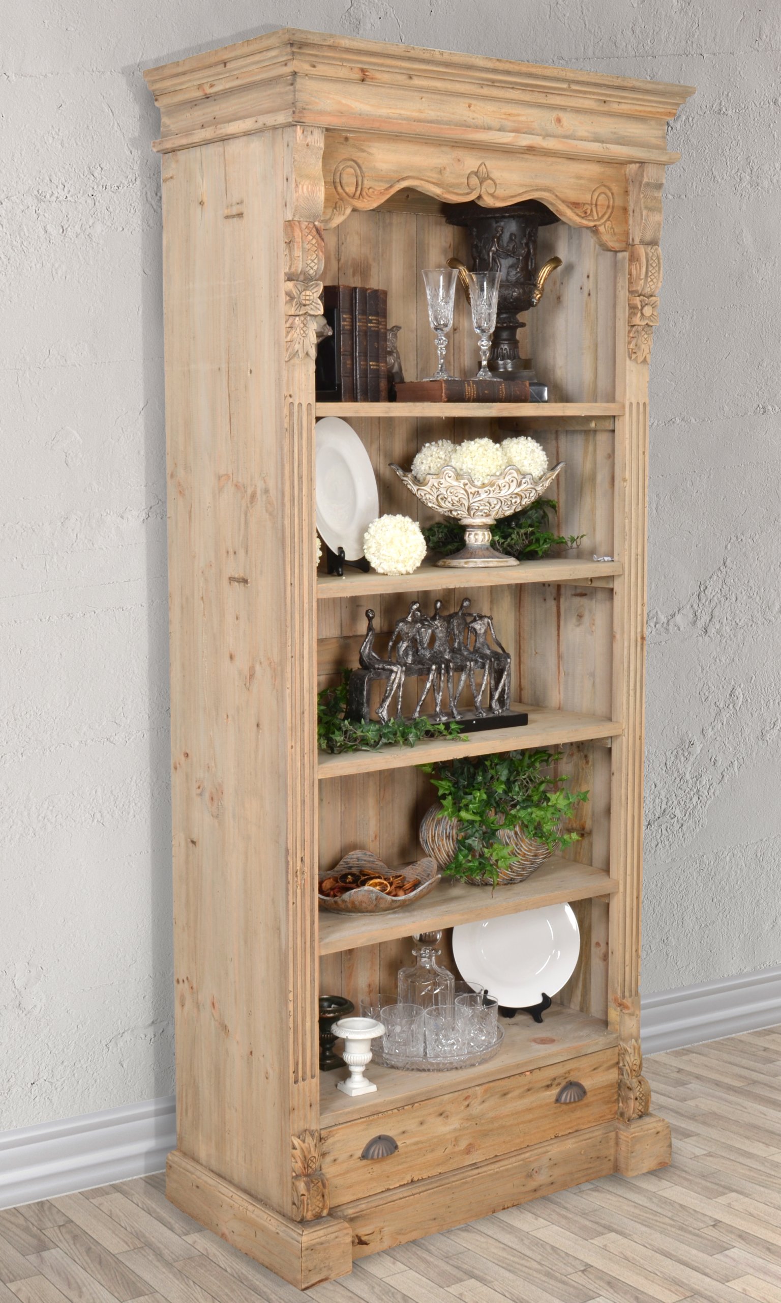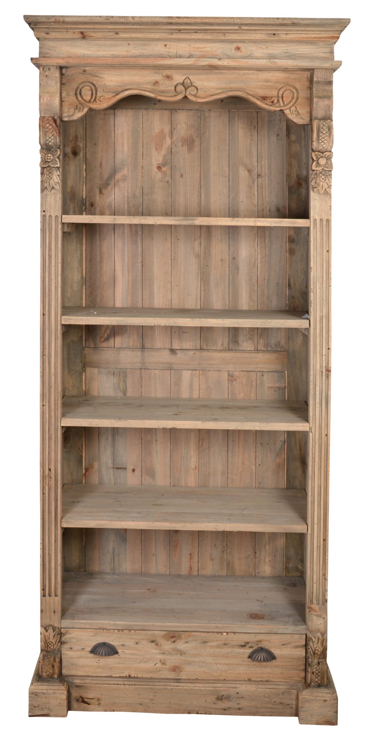 The Coastal Bookshelf is a typical designed bookshelf, it features a crown supported by a carved header over 4 large open shelves for visual display and a drawer in the base. It is part of a popular new Coastal Series from the Heritage Collection. The Coastal Series is an expanding series that is affordable yet appropriately fashioned for a more relaxed coastal life style. The style of the collection also can fit with farmhouse interiors as well as southern or new England designed more rustic homes. The items are all hand made using solid bleached pine from Indonesia. The item is sold individually and requires no assembly, customer often order in pairs for larger balanced displays. All of the Coastal Series pairs perfectly with each other and can be mixed matched and combined to increase the desired interior design.