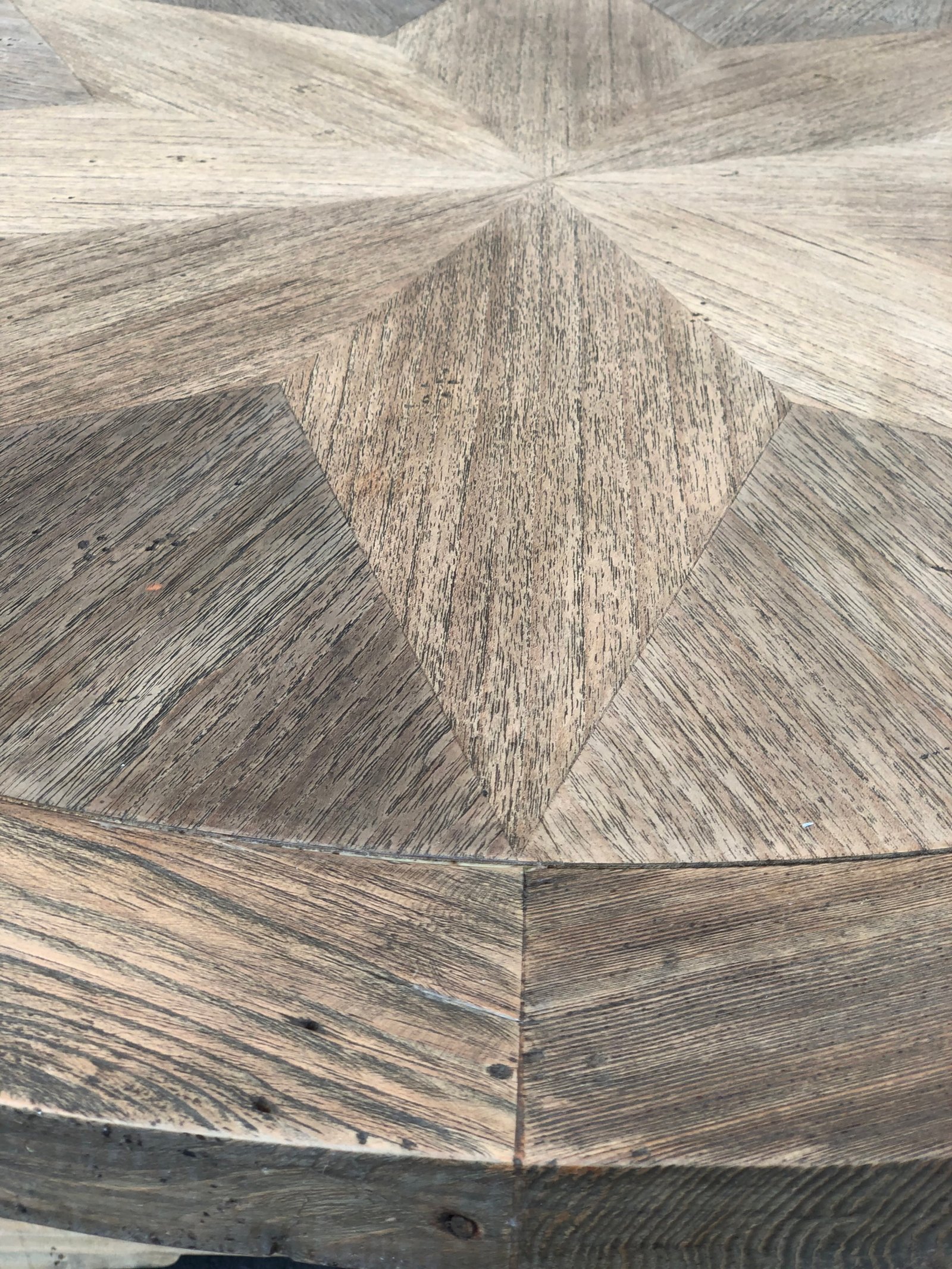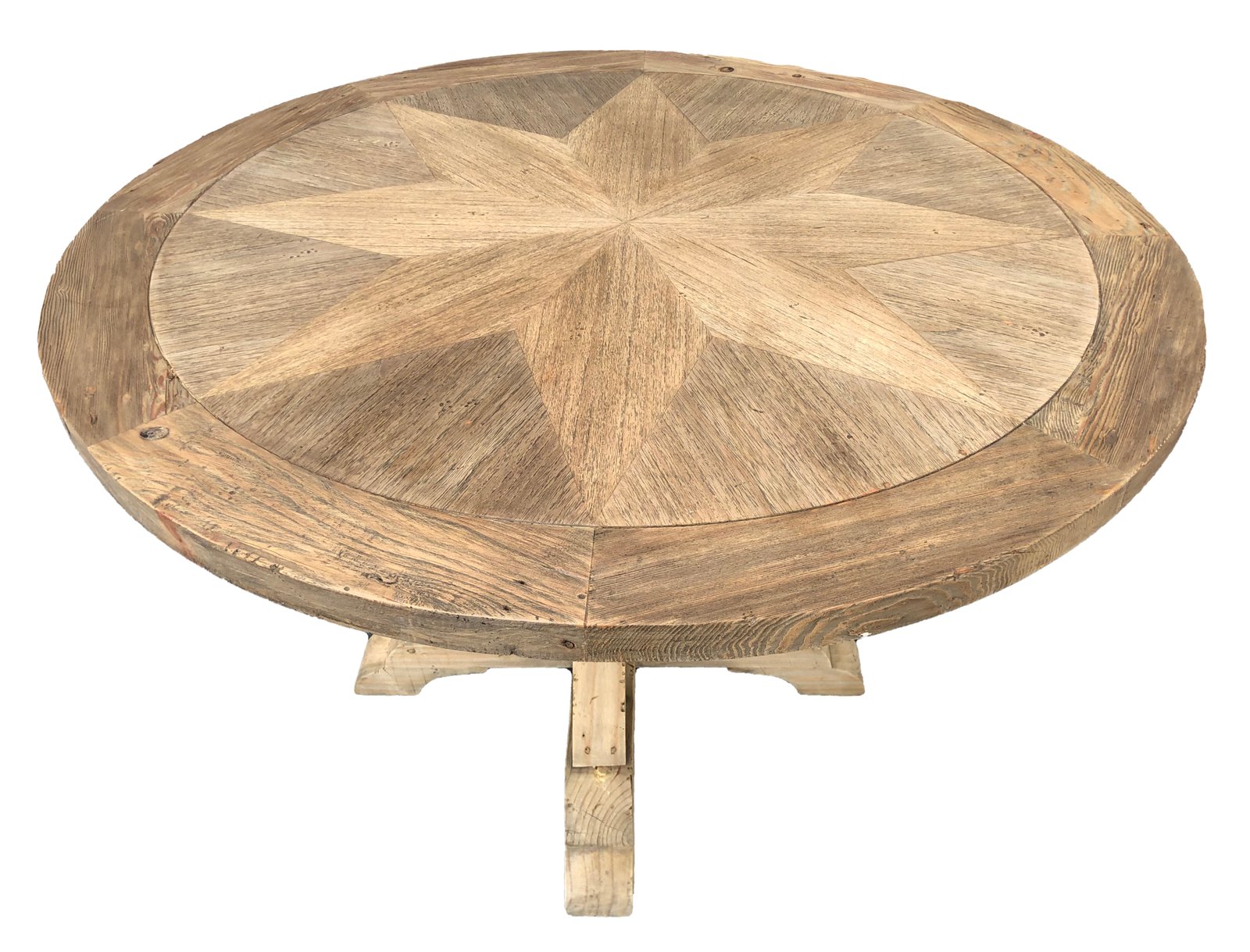 Our 48″ Diameter Farmhouse Round Table is an amazing engineered table creation utilizing hand inlay. This very rare to find hand-made yet properly engineered solid wood table was proudly made possible from a lifetime of furniture manufacturing experience. The center Geometric Star design is a fine inlay of environmentally sourced Mindi wood on top of a specifically created Multiplex for a lifetime of stability. The table base and top center bands are handcrafted using reclaimed solid New Zealand Pine that is specifically hand selected, sourced, and imported for the final combined effect. The hand finishing is an open grain Farmhouse style wood finishing giving protection but maintaining the very natural effects of the reclaimed and solid woods used. Minor assembly of the top to the base allows easier placement into the home. This table pairs with many chair options as well as hutches, sideboards, consoles, kitchen islands, and many more beautiful options from the American Farmhouse Collection from Heritage, a division of AFD Home.