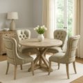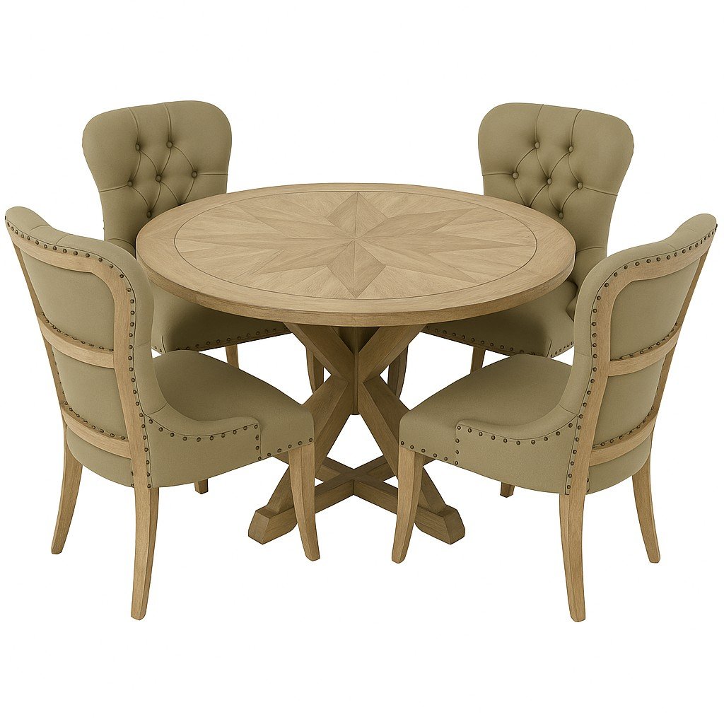 Add elegance and charm to your dining area with this beautifully crafted 5 piece round dining set. The standout feature is the intricately designed starburst 48 inch round wood inlay tabletop, sitting atop a sculpted pedestal base. Four faux leather upholstered chairs with button-tufted backs and nailhead trim surround the table, offering both comfort and timeless style. Perfect for kitchens, breakfast nooks, or small dining rooms, this set blends rustic warmth with refined detailing.