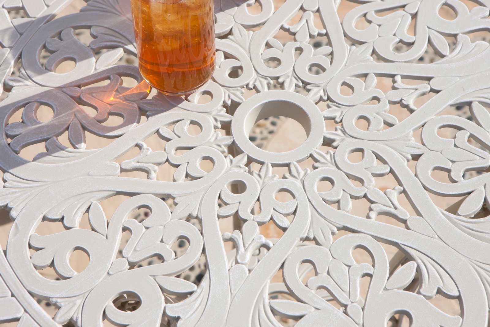 - Hand Dry Brushed, then Powder Coated in a Soft Ecru Outdoor Lasting Finish