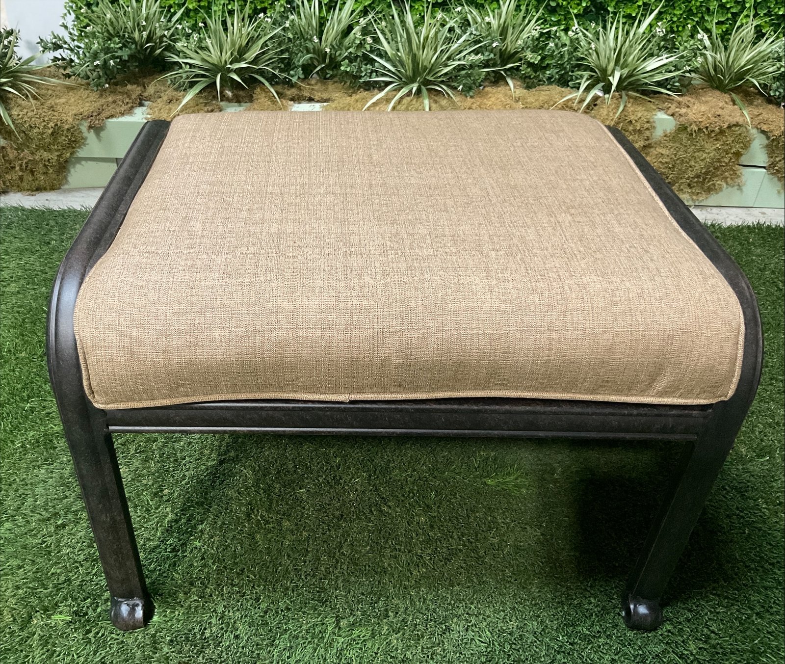 Bridgeton Moore presents the Fiesta Ottoman featuring an ottoman with a plush cushion finished in a brown bronzed tone with hand highlights that accent the details. The Fiesta Collection is one of the largest collections , the Ottoman pairs perfectly with the Fiesta Club Chair for an extended and more relaxing seating combination and the collection offers a wide assortment of other accompanying items enabling you to expand and create your entire outdoor area. The ottoman is fully constructed, meaning it is fully welded prior to finishing, the best process to insure long lasting heavy duty stability with No Assembly required. The cushion is a special quick drying foam and covered in a rich beige linen Sumbrella Brand fabric, considered amongst the best fabric for long lasting outdoor use in the industry. The ottoman is constructed in 100% aluminum that will never rust with a long lasting powder coat finish. Bridgeton Moore has established high brand quality standards and offers one of the best warranties in the Industry, 3 years on all frames and finish under normal conditions, fabrics are all Sumbrella grade and come with a manufacturers supplied two years against any manufacturing defects and or fading from date of purchase. Note * All products used outdoors require reasonable care and that level of care depends on varying external conditions. Covers are recommended for year round outdoor exposure and especially for all coastal applications. Extended exposure in coastal areas can cause corrosion and while this product is used in many coastal applications, they are voided from warranty. Simple hosing down or rinsing off salt exposure if/any will protect and extend the beautiful finish. The fabrics can be easily cleaned in a variety of ways and Sumbrella fabrics are so colorfast they can withstand even the use of bleach.