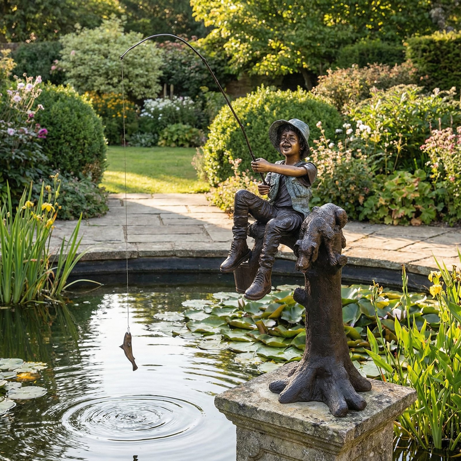 The Fishing Boy on Tree 65 inches is a life size Garden Sculpture in Lost Wax Cast Bronze. It measures 71 inches wide with an outstretched Fishing Line X 35 inches deep x 65 inches tall. A life size sculpture depicting a boy and his best friend perched on a tree limb fishing. This natural back yard design lends itself to be used in a natural or designed water setting, perhaps placed over a natural water stream, lake, brook, or incorporated into a pool or pond design. This Playful Garden subject is finished in a beautiful hand applied Italian Patina combination of Verde and Brown. Lost Wax Cast Bronze creations are virtually Timeless. Bronze, as a favored metal allows the artist to create these types of depictions in a higher level of detail as well as offering a metal that does not rust. Bronze primarily made of Copper actually self protects itself and creates an outer protective coating referred to as Patina. Suitable for Interior or Exterior Display. Consider collecting other Children Subject designs from the Children’s Collection of Timeless Creations, a division of AFD Home. Hand Cast and Finished in Thailand. No Assembly Required.