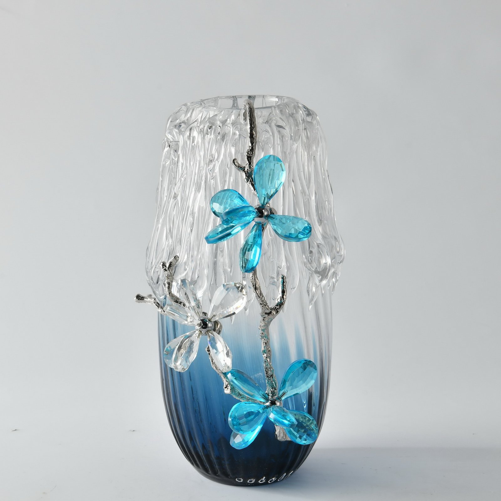 Elevate your decor with the Frosted Glacier Bloom Vase 12″H, a smaller yet equally captivating counterpart to our Glacier Bloom design. With its cascading clear glass detail, rich blue to clear ombre base, and shimmering crystal flower accents, this vase captures the beauty of winter tides and coastal elegance in a single silhouette.