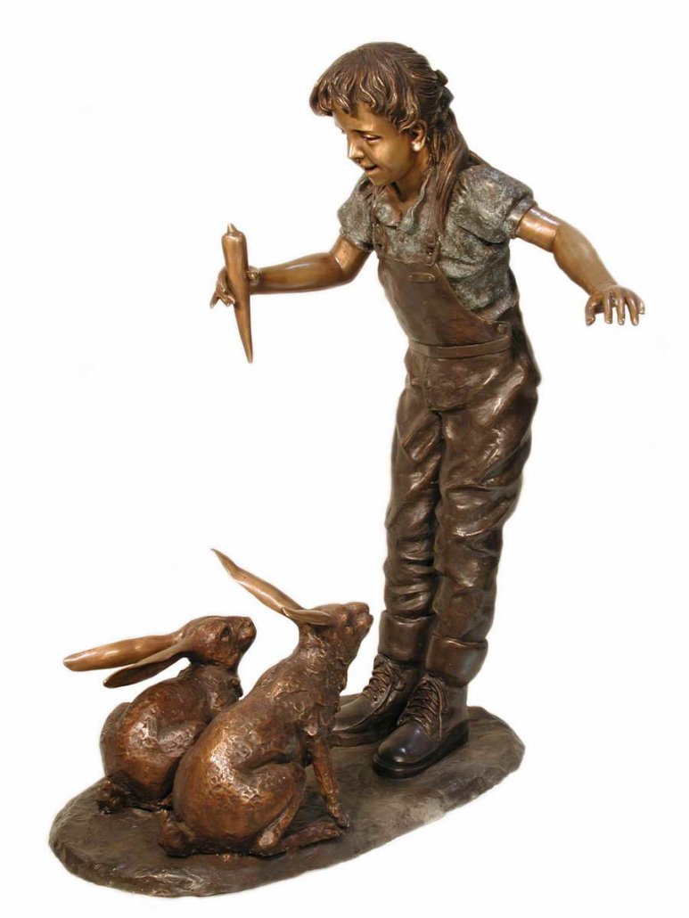 A life size girl feeding her rabbit. A sweet subject by artist depicting the sweetness of youth using lost wax cast bronze to last for iternity with brown tone patina finishing to accent details.