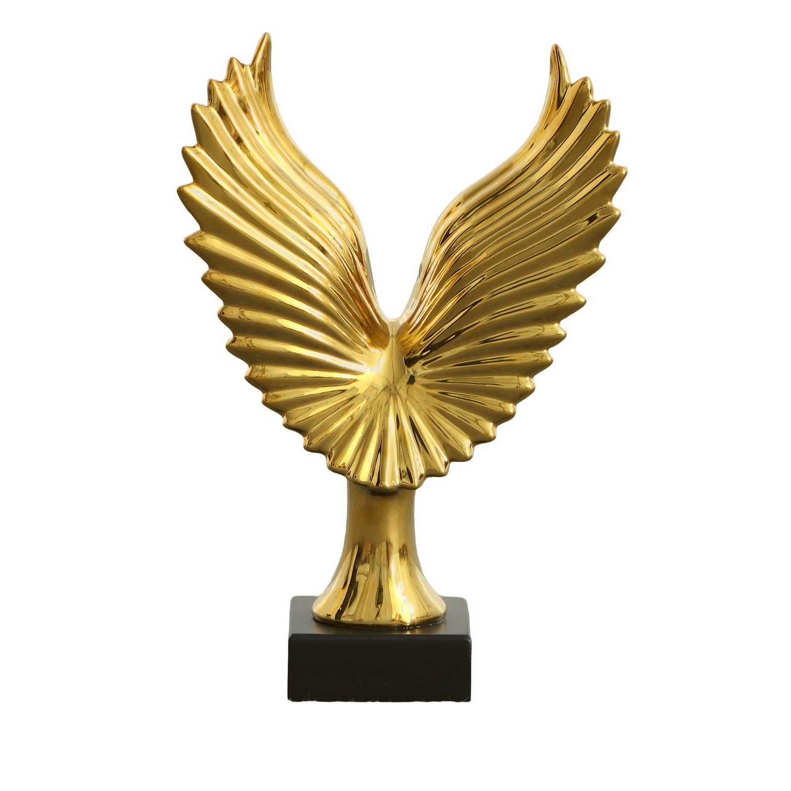 The Gold Mockinjay Sculpture from AFD Home stands at 13in tall with a width of 9.5in. The vibrant gold finish on top of the ceramic figure depicting the Mockinjay is mounted on a black base to provide the perfect amount of contrast and make this piece standout even more.