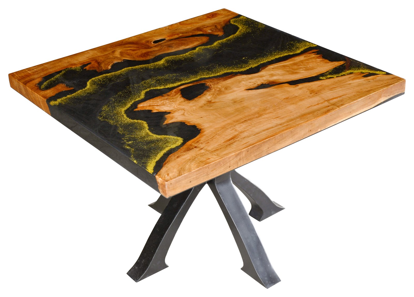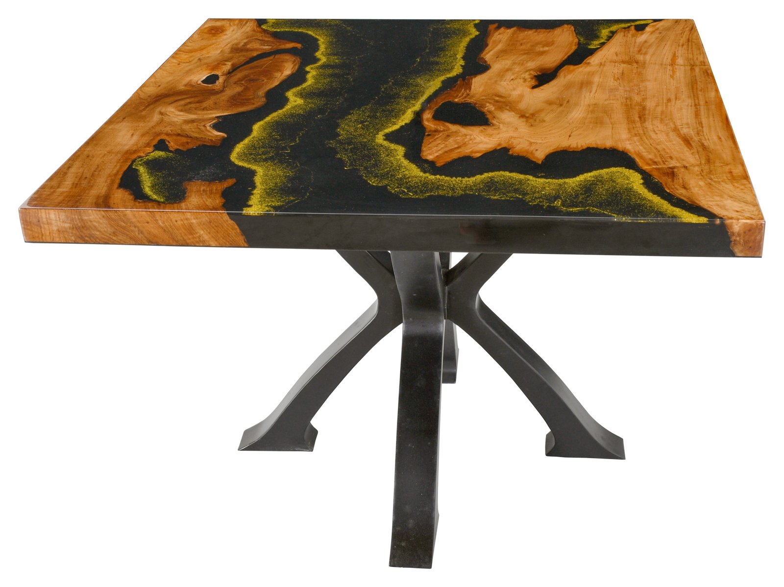 Elevate your interior with the striking Golden Glow Acrylic Square Table. Designed with a captivating golden acrylic inlay that mimics liquid gold flowing through rich natural wood. This table is more than just furniture it is a conversation piece. Supported by a sturdy, sculptural iron base, this table perfectly blends organic warmth with industrial edge, ideal for modern, eclectic, or artistic spaces. Ideal as a dining table, accent table, or artistic display piece in residential or commercial spaces.