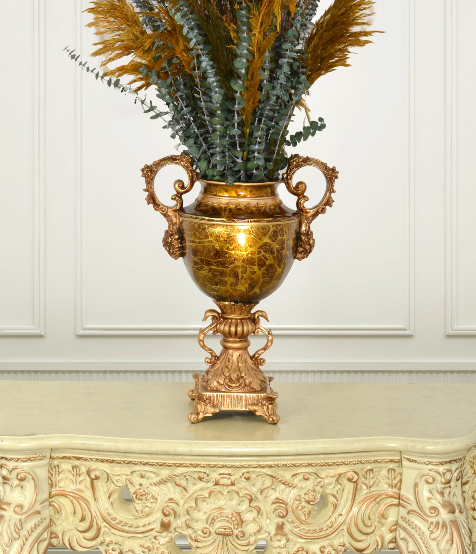 A Golden Swirl Vase 18.5 Inches Tall. This classic handled urn with acanthus design elements standing 14.5″diameter x 18.5″ tall. The beautiful finish features an interesting technique where the artists used a padded umber over a gold base to create a very soft swirled and layered affect under a rich lacquerware topcoat. The vase is hand cast in durable. Sold separately but often ordered in pairs for balance and symmetry.