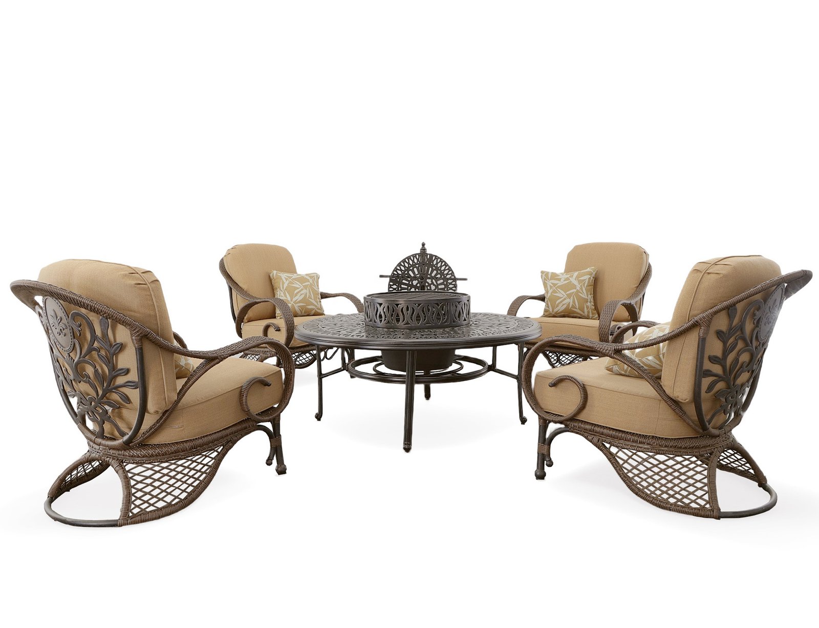 - Bridgeton Moore presents the very popular Grand Bonaire Weave 6 Piece All Inclusive Club Chair Set from our fashionable Grand Bonaire Weave Collection. Featuring 4 comfortable deep seating club chairs with plush seat and back cushions and accent pillows and the matching and very popular patented Bridgeton Moore Grand Bonaire Weave All-Inclusive Table. The provided all-inclusive Fire Pit & Accessory Package enables the table to become a wood burning fire pit or a barbecue grill and also includes an ice bucket which fits into the center of the table and can be used with or without the fire pit and stores under the table in a specially designed holder when using the other fire pit table options. The collection’s designers captured the emerging trend, popular in high end outdoor furniture, of bringing interior fashions outdoors. To create this exclusive and very beautiful collection the designers combined a beautiful cast aluminum design and softened it by adding intricate hand weaving. The design features scrolling elements finished in a brown bronzed tone with hand highlights that accentuate the details, then a multistep powder coat finish is applied that enables a longer lasting outdoor finish. The Grand Bonaire Weave Collection is a large collection and this All Inclusive Club Chair set pairs perfectly with the Grand Bonaire Weave Chaises. The collection offers many other accompanying items enabling you to expand and create your entire outdoor area. You will never find screws used in a Bridgeton Moore Seat, the chairs are fully constructed in a 100% aluminum frame, meaning it is fully welded prior to finishing, the best process to insure long lasting heavy duty stability that will never rust. The chair design is further enhanced by delicate hand weaving in all-weather natural looking synthetic polyethylene. The cushions are special quick drying foam and covered in a soft beige linen Sumbrella Brand fabric with a designer selected accent pillow also in Sumbrella fabric, considered amongst the best fabrics for long lasting outdoor use in the industry. The table can be used with or without the included Fire Pit and Accessory Package and owners often like this flexibility enabling them to also use the table as a conventional umbrella table or table with the Ice bin only. The well thought through design enables owners to store these extra items away, keeping them clean and ready for use on those special times when they will enhance your use of all that this set offers. The provided accessory package includes 1) a decorative fire pit ring which fits into the center of the table 2) An Iron fire pit 3) A safety net 4) An aerator for inside the fire pit which allows for better burning 5) a grease trap which attaches under the pit to catch drippings 6) A barbecue grill grid designed to sit on top of the fire pit 7) A decorative stand to neatly store all accessories when not in use and 8) A wood and iron handled tool for removing accessories when hot. Bridgeton Moore has established high brand quality standards and offers one of the best warranties in the Industry, 3 years on all frames and finish under normal conditions, fabrics are all Sumbrella grade and come with a manufacturers supplied two years against any manufacturing defects and or fading from date of purchase. Note * All products used outdoors require reasonable care and that level of care depends on varying external conditions. Covers are recommended for year round outdoor exposure and especially for all coastal applications. Extended exposure in coastal areas can cause corrosion and while this product is used in many coastal applications, they are voided from warranty. Simple hosing down or rinsing off salt exposure if/any will protect and extend the beautiful finish. The fabrics can be easily cleaned in a variety of ways and Sumbrella fabrics are so colorfast they can withstand even the use of bleach. Table assembly required. Set Includes: Sku: 10851642 Grand Bonaire Weave Fire Pit Accessories Qty 1 Sku: 10864857 Grand Bonaire Weave Outdoor Club Chair Qty 4 31.00 x 36.00 x 35.00 Sku: 10851634 Grand Bonaire Weave Fire Pit and Base Only Qty 1 Sku: 10635042 Table Basin Qty 1 Sku: 10866932 Grand Bonaire Weave 52in Table Qty 1 52.00 x 52.00 x 22.0