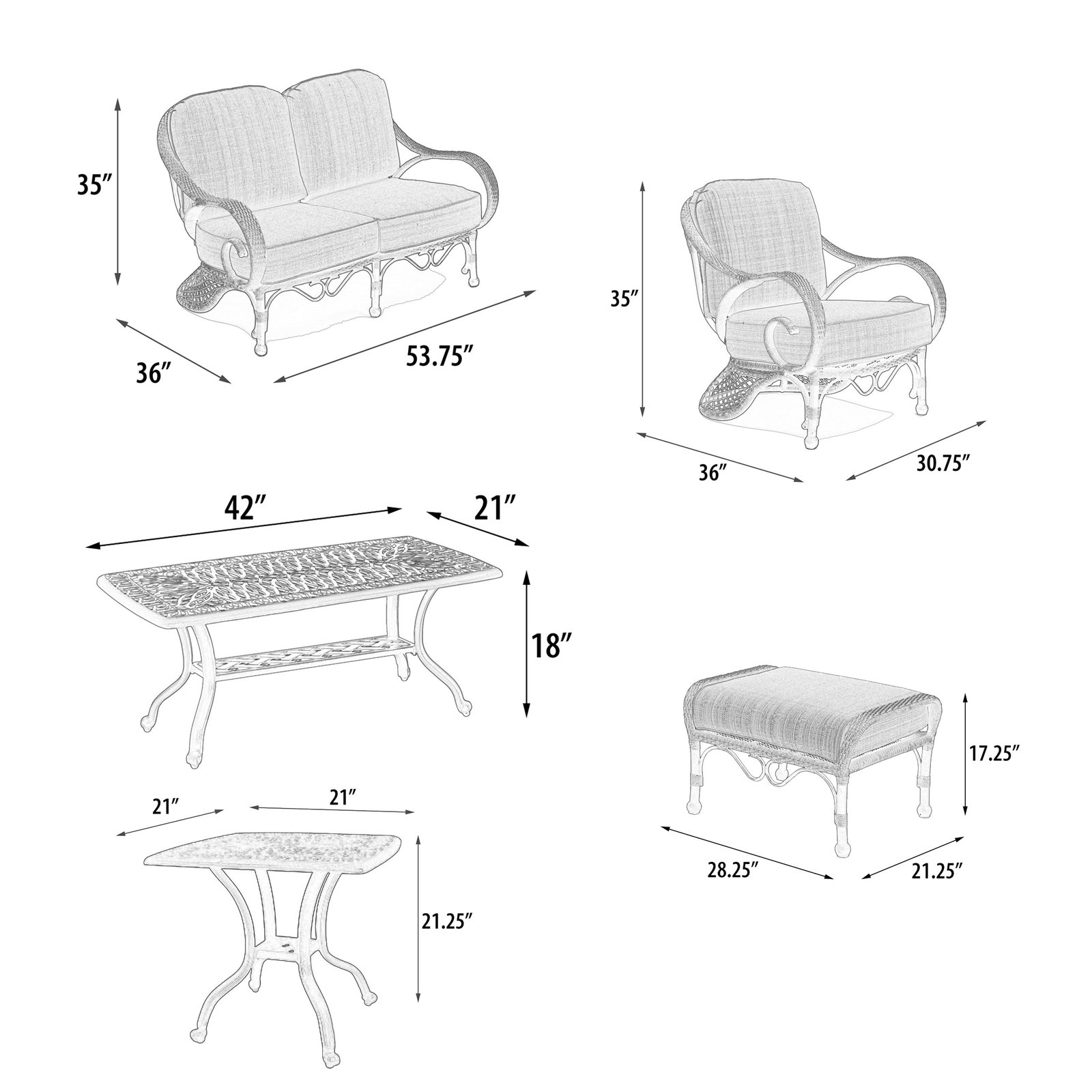 - Bridgeton Moore presents the Grand Bonaire Weave 7 Piece Outdoor Set featuring 2…. comfortable deep seating Grand Bonaire Weave Club Chairs, 1….. Grand Bonaire Weave Loveseat all with plush seat and back cushions and accent pillows, 2…… matching Grand Bonaire Weave Ottomans with plush cushions, 1…..Grand Bonaire Weave Cocktail Table and 1….. Grand Bonaire Weave Side Tables. The collection’s designers captured the emerging trend, popular in high end outdoor furniture, of bringing interior fashions outdoors. To create this exclusive and very beautiful collection the designers combined a beautiful cast aluminum design and softened it by adding intricate hand weaving. The design features scrolling elements finished in a brown bronzed tone with hand highlights that accentuate the details, then a multistep powder coat finish is applied that enables a longer lasting outdoor finish. The Grand Bonaire Weave Collection is a large collection that offers many other accompanying items enabling you to expand and create your entire outdoor area. You will never find screws used in a Bridgeton Moore Seat, the chairs, loveseat and ottomans are a fully constructed 100% aluminum frame, meaning they are fully welded prior to finishing, the best process to insure long lasting heavy duty stability that will never rust. The chairs, loveseat and ottomans design is further enhanced by delicate hand weaving in all-weather natural looking synthetic polyethylene, no assembly is required on them however the tables requires light assembly. The cushions are special quick drying foam and covered in a soft beige linen Sumbrella Brand fabric with a designer selected accent pillow also in Sumbrella fabric, considered amongst the best fabrics for long lasting outdoor use in the industry. The cushions are all special quick drying foam and covered in a rich beige linen Sumbrella Brand fabric, with designer selected accent pillows also in Sumbrella fabric considered amongst the best fabric for long lasting outdoor use in the industry. Bridgeton Moore has established high brand quality standards and offers one of the best warranties in the Industry, 3 years on all frames and finish under normal conditions, fabrics are all Sumbrella grade and come with a manufacturers supplied two years against any manufacturing defects and or fading from date of purchase. Note: All products used outdoors require reasonable care and that level of care depends on varying external conditions. Covers are recommended for year round outdoor exposure and especially for all coastal applications. Extended exposure in coastal areas can cause corrosion and while this product is used in many coastal applications, they are voided from warranty. Simple hosing down or rinsing off salt exposure if any will protect and extend the beautiful finish. The fabrics can be easily cleaned in a variety of ways and Sumbrella fabrics are so colorfast they can withstand even the use of bleach. Minor assembly of tables required. Set of 7 Includes: Sku: 10866959 Grand Bonaire Weave Outdoor Coffee Table Qty 1 42.00 x 21.00 x 18.00 Sku: 10864857 Grand Bonaire Weave Outdoor Club Chair Qty 2 31.00 x 36.00 x 35.00 Sku: 10864890 Grand Bonaire Weave Outdoor Ottoman Qty 2 28.00 x 21.50 x 17.00 Sku: 10866941 Grand Bonaire Weave Outdoor Side Table Qty 1 21.00 x 21.00 x 21.00 Sku: 10864865 Grand Bonaire Weave Outdoor Loveseat Qty 1 54.00 x 36.00 x 35.00