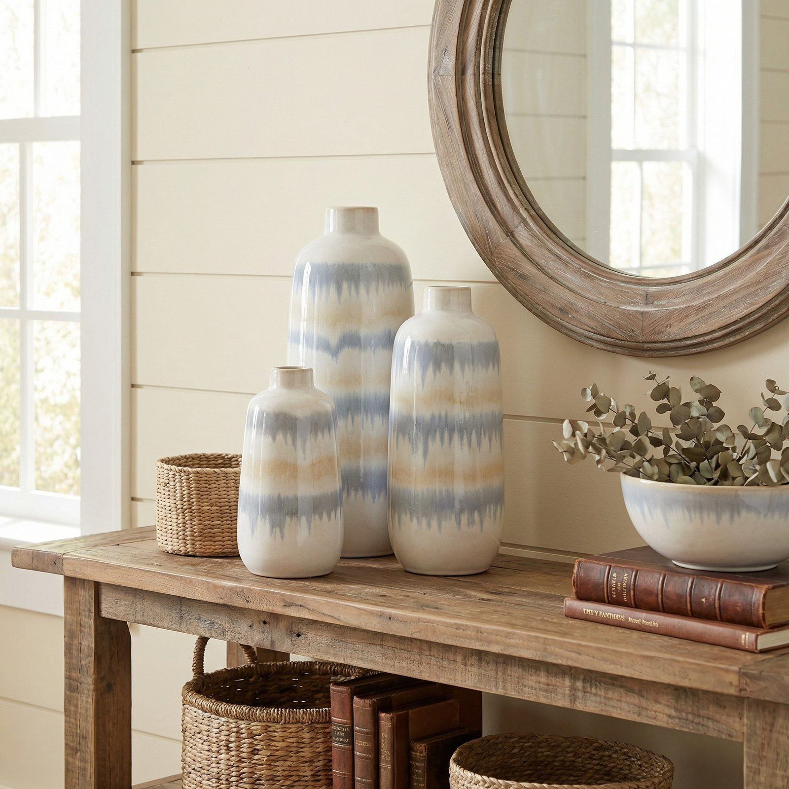 A stylish Gray Sand Vase Set of 3 offers three distinct Artistic Vases in varying heights widths. The set is Hand Cast in Porcelain. The finish uses an attractive fusion of different fashionable glazing colors over a white glazed form. They offer an artistic flair to functional shapes. The vases can be enhanced with flowers or used stand alone as decorative Objects of Art. No Assembly Required.