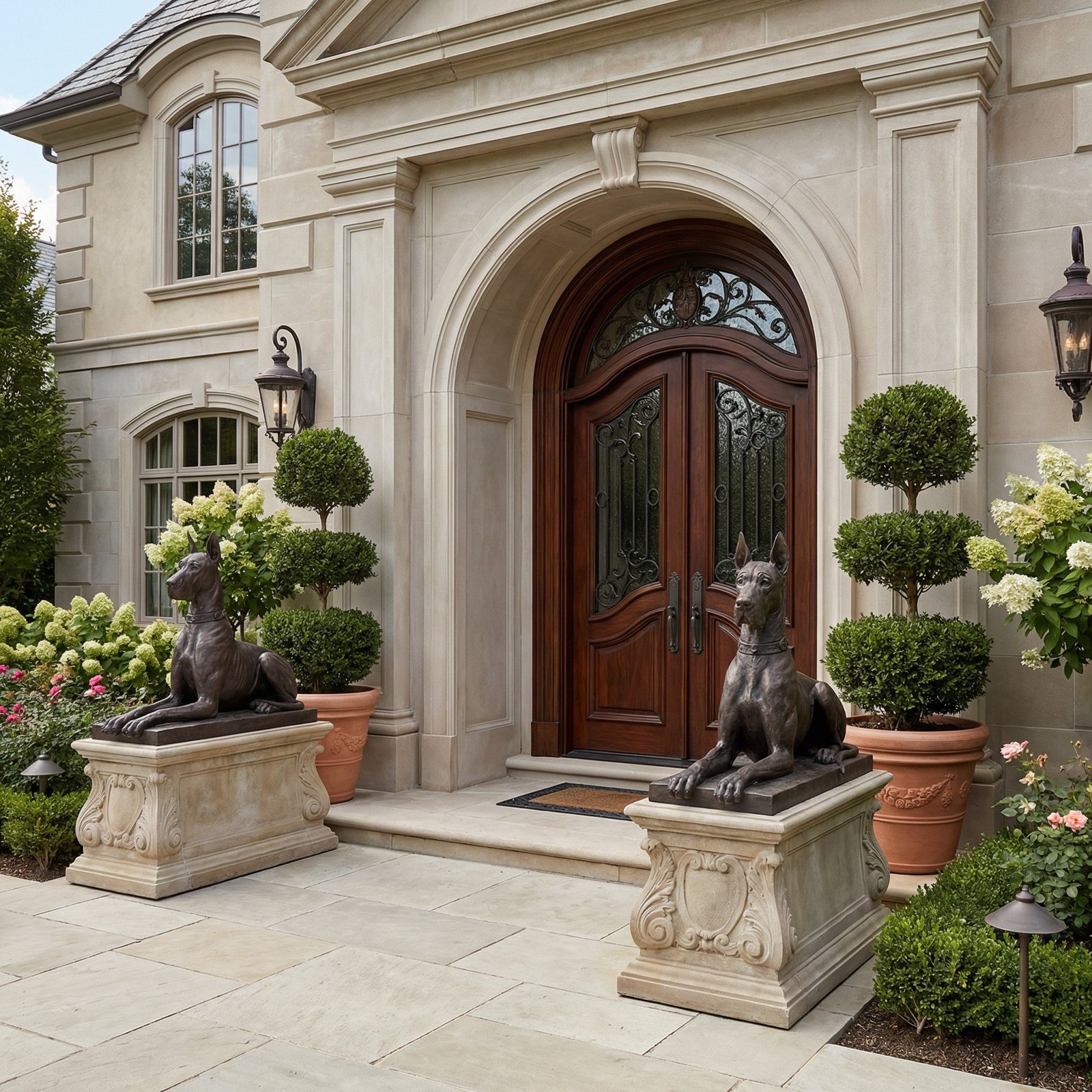 The Great Dane Faux Bronze Set Of 2 are whimsical pieces of decor created from fiberglass and hand-finished capturing the most intricate details creating a lifelike Great Danes!