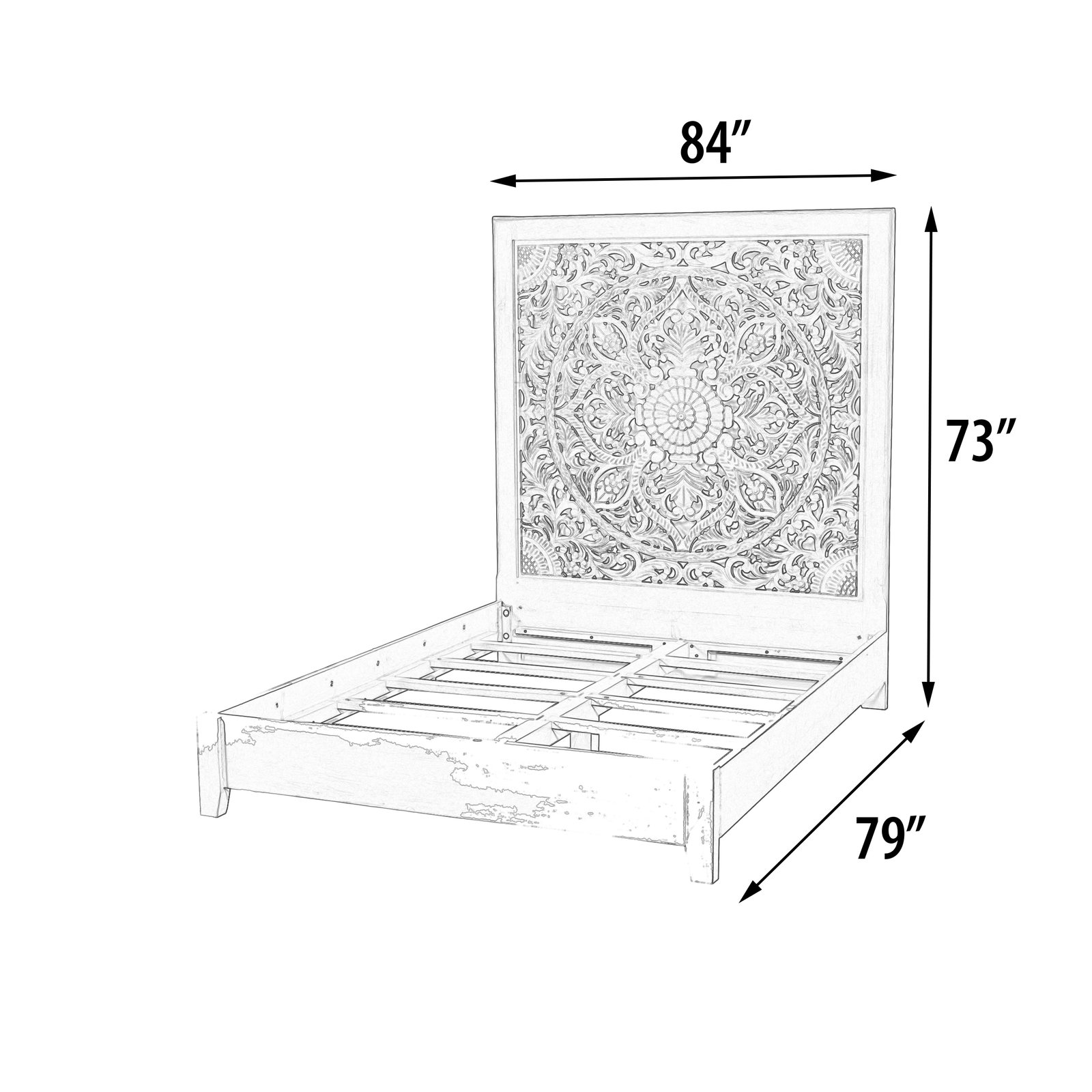 An Exciting Find for our clients looking for a very Special Bed A design that provides a perfect start for You to Personalize Your Room and Create your vision of the perfect Bedroom. The Bed is a good start featuring an elegant and unique Headboard with Fully Carved Lace Design. The Bed design is easily placeable, offering a Casual transitional styling that is also a perfect match for Coastal or Farmhouse trends. It is hand made in solid wood. The finishing is a painted white wash offering a light and bright Palette. Bed offered is King Size. Also available in Queen size, matching side cabinets, dressers are also available to complete the Room. Hand Made in India for AFD Home. The Bed comes complete with headboard, footboard, side rails and slats. Assembly Required