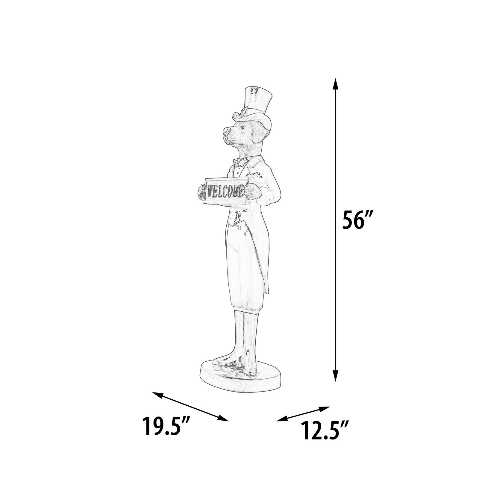 Imagine being greeted by this distinguished canine figure standing at an impressive 56 inches tall. Clad in a striking red tuxedo, crisp white trousers, and polished black boots, this stylish dog exudes a charm that is both whimsical and elegant. Topping off the look with a classic top hat, this delightful character holds a “Welcome” sign, inviting guests to your space with a touch of playful sophistication. This piece captures a blend of fun and formality, making it a perfect addition to liven up an entryway, a quirky boutique, or a special corner of your home that calls for a cheerful welcome.