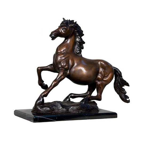 A decorative 18 ” wide x 18.5″ tall standing classic Horse sculpture. A Timeless Creation captured in lost wax bronze with brown patina on marble bases