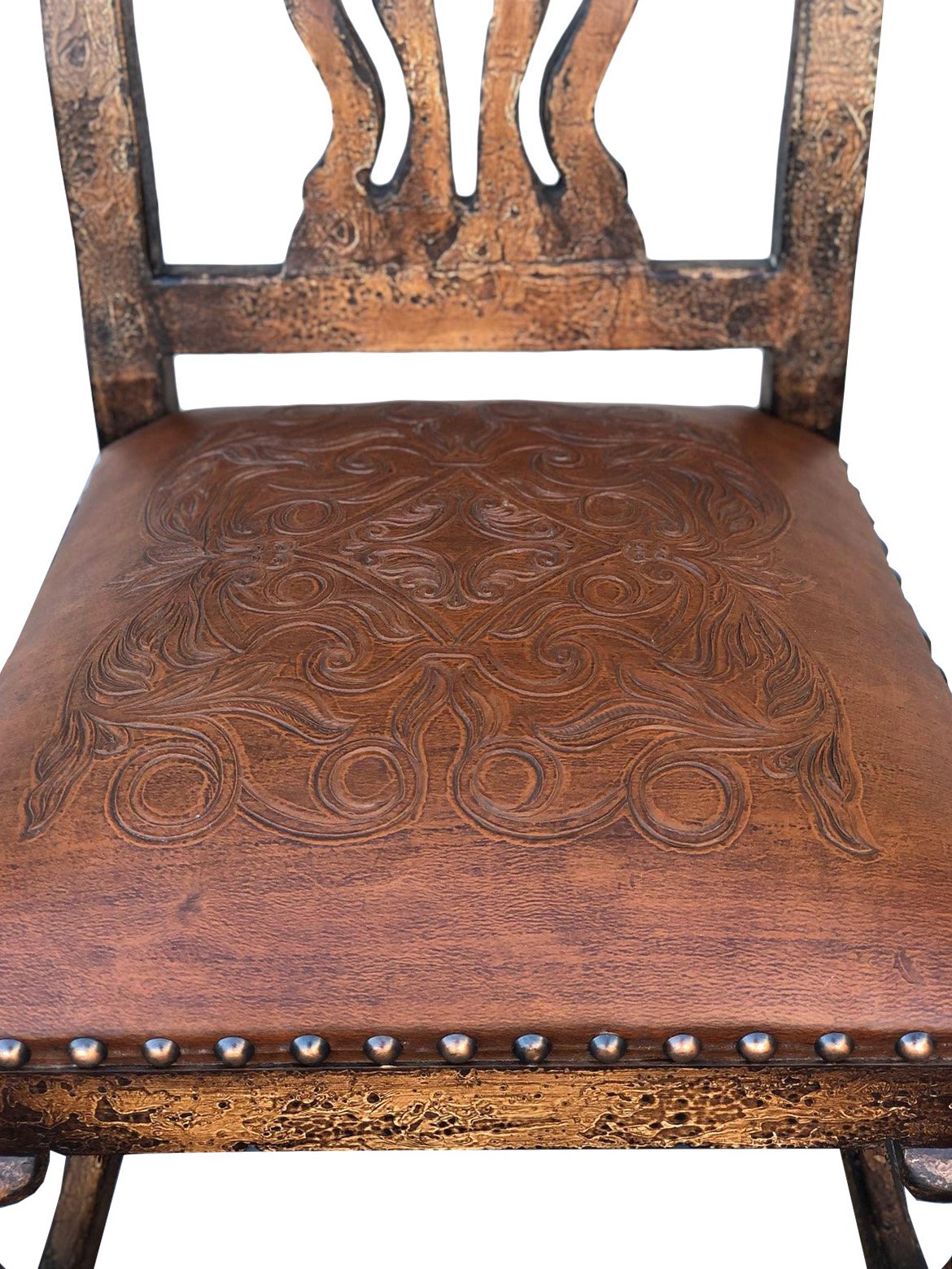 The Juliana Carved Leather Side Chair is beautiful hand made chair with hand carved leather seat and part of the newest Juliana Peruvian Dining Room Collection. The chair is offered here separately but can also be combined with the matching table set. This series boasts a Spanish influence with large scaled details and its multi layered finish of light and dark sienna and brown tones with subtle natural contrasts resulting from hand rubbing and exposing the rich wood undertones then delicately detailed with hand painted soft scrolls. There are many options to add on and perfect your dining room design. Whether you are looking just for a special Chair like this or would prefer to order the complete set with Table and Bench options. This collection is expansive and when space is available consider adding any of the matching side boards, wine cabinets and or buffets. The Juliana series is part of our Santa Lucia Collection which consists of handmade, hand painted, and distressed solid wood furniture making each piece a timeless investment. Hand crafted treasures made one piece at a time, under one roof, by our exclusive family owned manufacturer from Lima, Peru. Their master artisans are skilled in furniture making techniques influenced by the Spanish during the colonization of Peru. Many items in the diverse collection feature specialty hand painted finishes that have also been passed on and perfected from generation to generation. The family strives to be environmentally friendly by using woods re-purposed from haciendas and old colonial homes as well as wood indigenous to South American forests, primarily mahogany, cedar, moena and requiem. If you are a lover of beautiful painted furniture, find hill country rustic romantic, or find richness in Mediterranean lore Then you too may fall in furniture love with this fine collection.