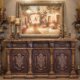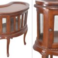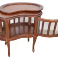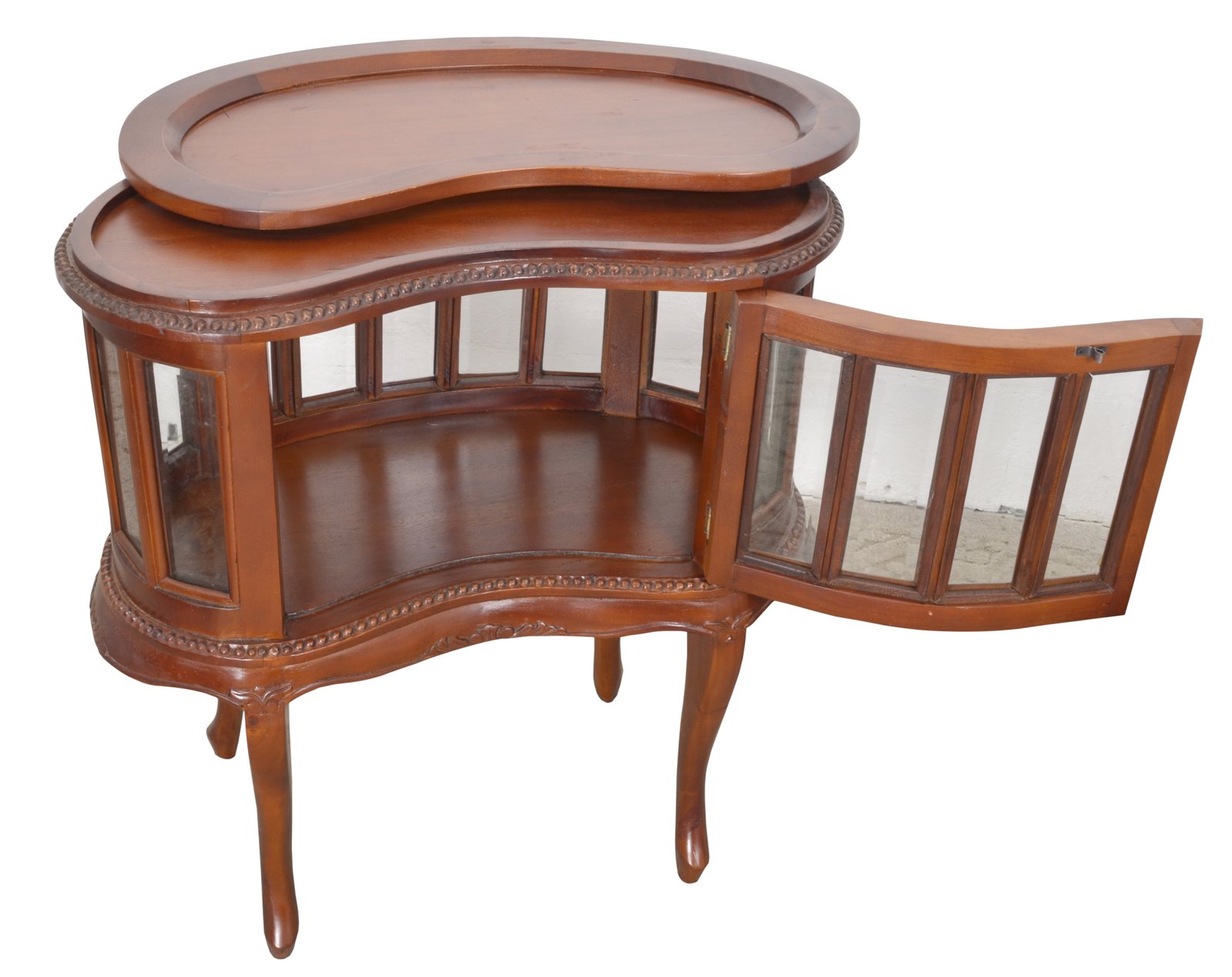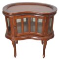 Our Kidney Chocolate Table is a recreation of a traditional display cabinet 29.5″ wide x 17.5 ” deep x 30.5″ tall. It features a removable tray that was originally intended in the design as a serving tray, a shapely display cabinet surrounded by individual beveled glass panels and a door atop 4 legs. The item is hand carved in mahogany with a mahogany finish. Made by hand and imported from Indonesia.